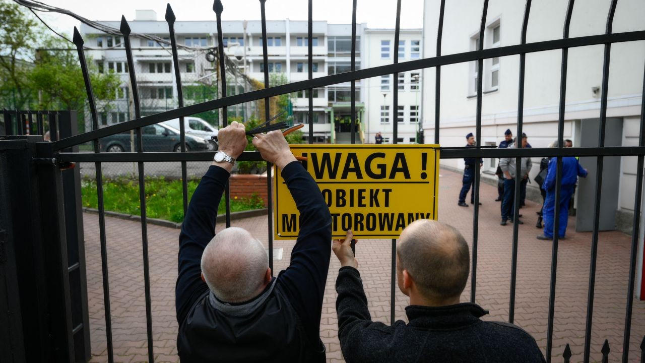 Giới chức Ba Lan dán biển cảnh báo tại một cổng ra vào tòa nhà trường học thuộc quyền quản lý của Đại sứ quán Nga tại Warsaw ngày 29/4. (Nguồn: AFP/Getty Images) |