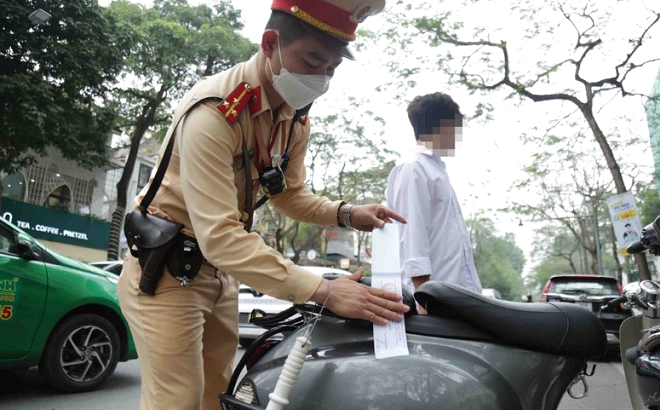 CSGT niêm phong, tạm giữ phương tiện một trường hợp học sinh vi phạm. Ảnh: CAHN |