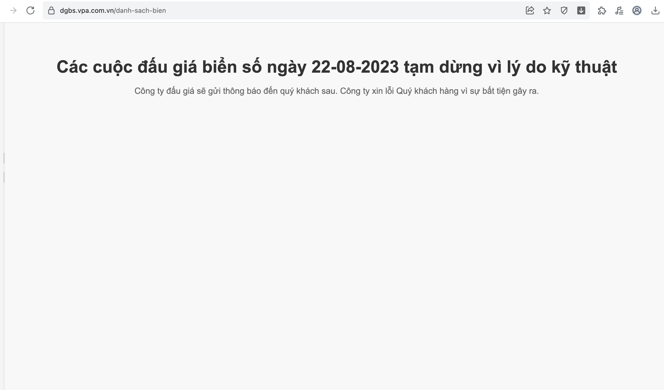 Đến khoảng hơn 10h, trang web đấu giá trực tuyến hiện thông báo: "Các cuộc đấu giá biển số ngày 22/8/2023 tạm dừng vì lý do kỹ thuật. Công ty đấu giá sẽ gửi thông báo đến quý khách sau. Công ty xin lỗi quý khách hàng vì sự bất tiện gây ra".