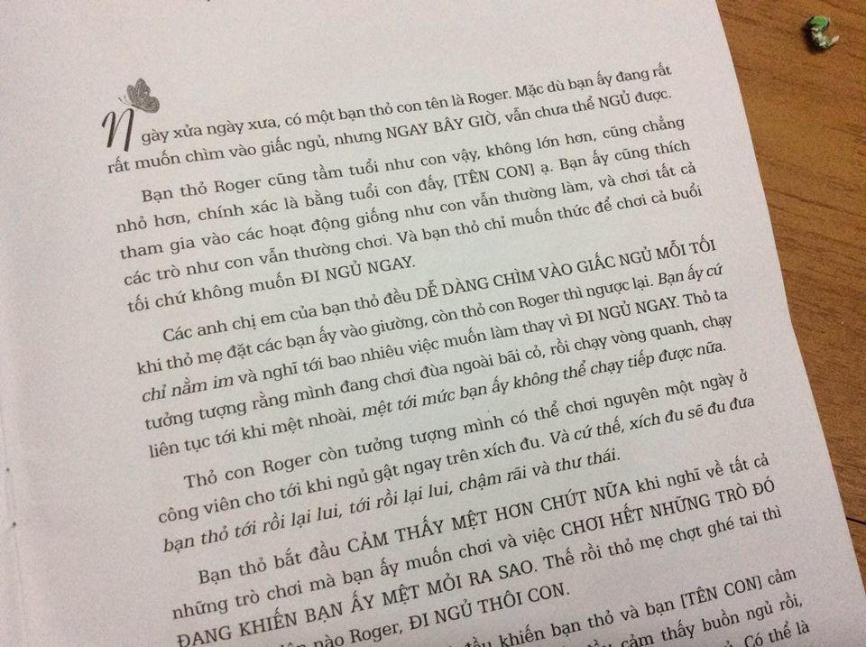 Cuốn sách mở đầu như sau: "Ngày xửa ngày xưa có một chú thỏ có tên là Roger. Chú rất muốn đi ngủ nhưng không thể ngủ được. Chú thỏ Roger cũng bằng tuổi của... (tên em bé - bố mẹ sẽ tự thêm). Chú thỏ thích thức khuya và chơi đùa hơn là đi ngủ. Tất cả những anh chị em thỏ khác đều dễ dàng chìm vào giấc ngủ mỗi tối khi mẹ thỏ cho các bạn đi ngủ nhưng Roger thì không. Roger chỉ thích nằm xuống và nghĩ về những điều mình thích làm thay vì đi ngủ"...