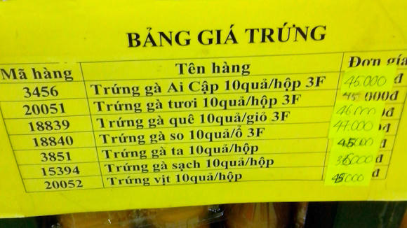 Tại siêu thị Hapromart Vân Hồ, giá trứng gia cầm được niêm yết vào những ngày gần đây cũng ở mức cao ngất ngưởng. Trứng gà ta, trứng vịt có giá 45.000 đồng/vỉ/10 quả; trứng gà công nghiệp màu 36.000 đồng/vỉ… Điều khó hiểu là siêu thị Hapromart là đơn vị tham gia chương trình bình ổn giá và trứng gia cầm là một trong những mặt hàng thuộc diện này.