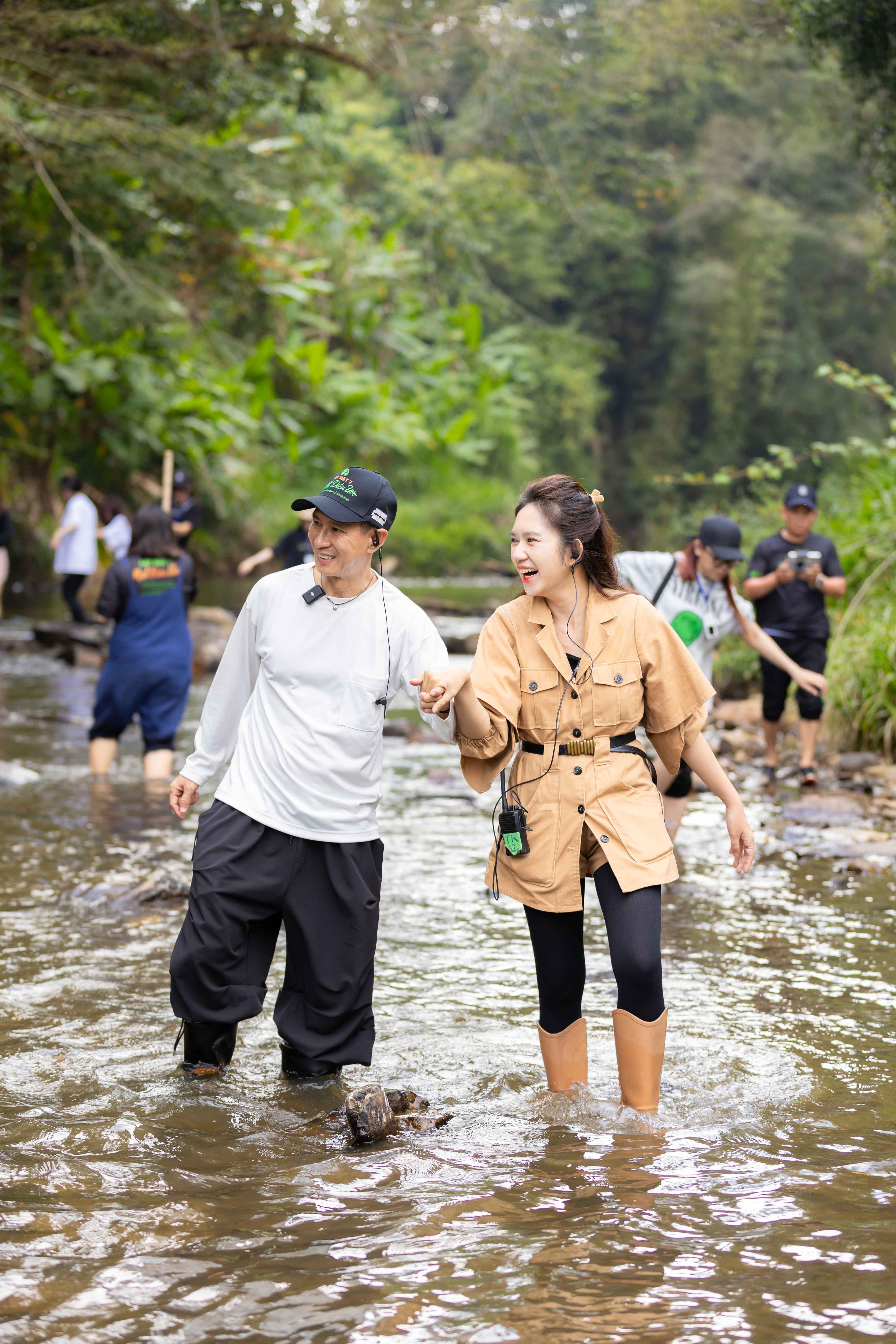 Vợ chồng Lý Hải - Minh Hà hào hứng cùng du khách lội suối. |