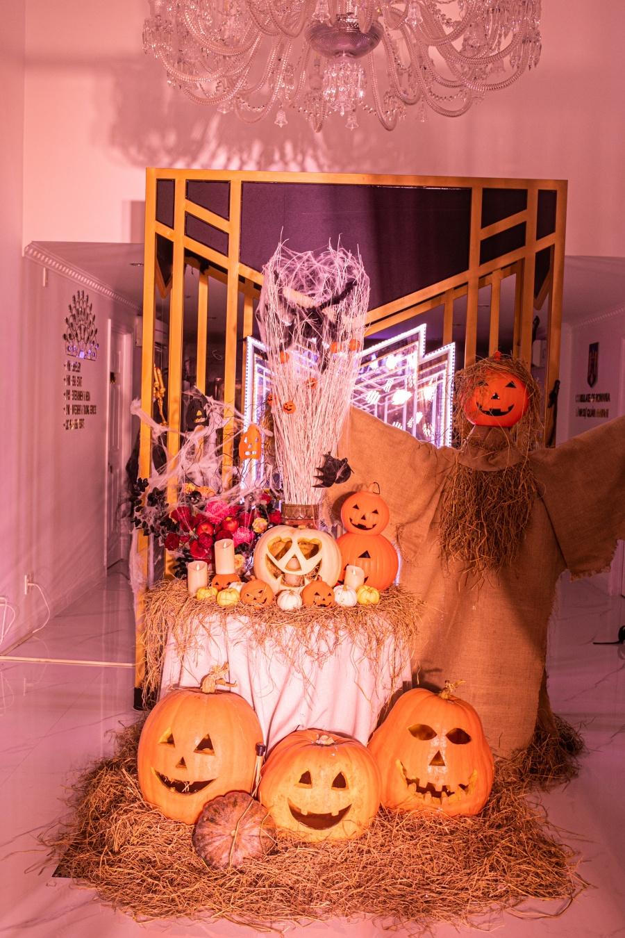 Những vật dụng trang trí trong biệt thự đều lấy cảm hứng từ sự kiện Halloween như: quả bí ngô, mạng nhện, hình nộm… |