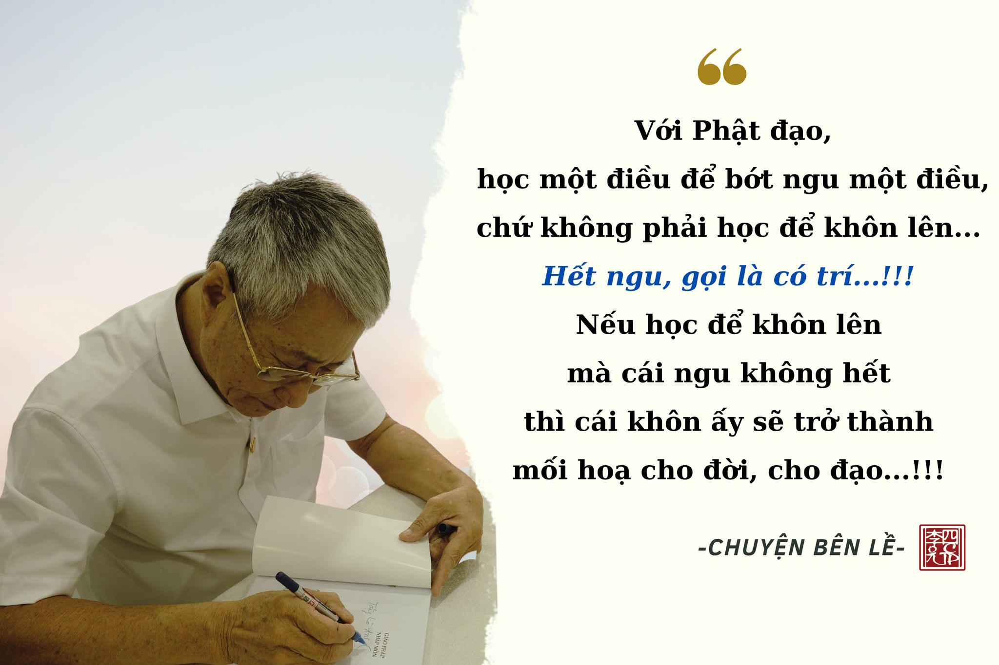 Với ông Nguyễn Xuân Sơn - một cán bộ đã nghỉ hưu, nhưng 25 năm qua, chưa bao giờ ông rời tu tập. Tuy nhiên, ông chưa tìm được điều mình cần tìm, cách đây hơn 1 năm, ông đã tìm được đến với tác phẩm của tác giả Lý Tứ.
