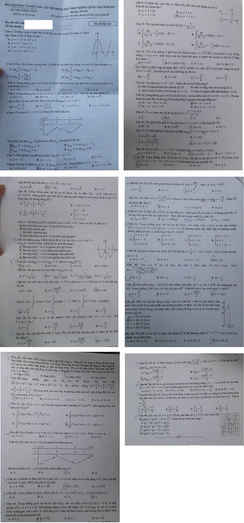 Mã đề thi số 124 môn Toán THPT Quốc gia và lời giải (PLO) - Chiều 22/6, thí sinh làm bài trắc nghiệm môn Toán THPT quốc gia 2017. Dưới đây là mã đề thi 124 và lời giải. Thứ Năm 22/06/2017 17:27 (GMT+7) Mã đề thi 124. Gợi ý bài giải môn Toán THPT quốc gia 2017 do Tổ giáo viên một chương trình giáo dục trực tuyến thực hiện. Nguyên Vũ - Ngọc Bảo