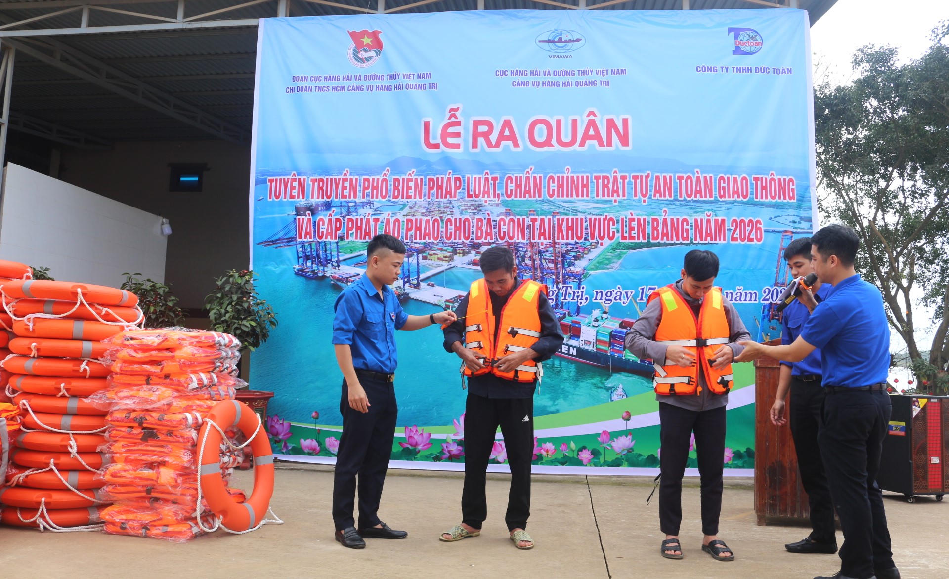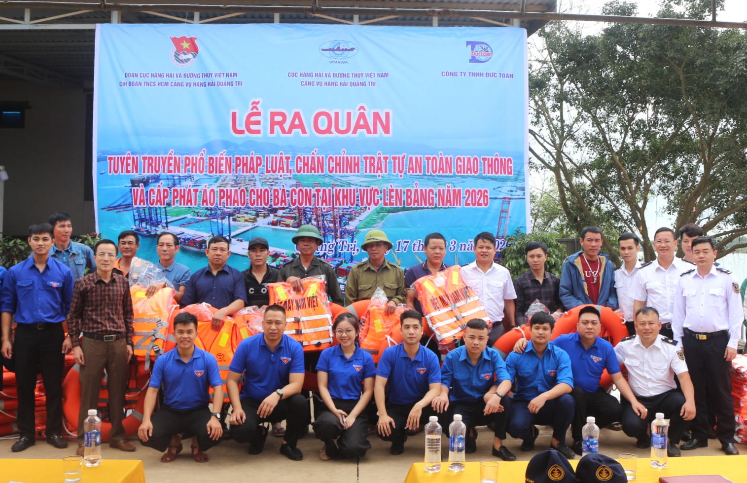Ngày 17/3, tại bến cảng nội địa Đức Toàn, Cảng vụ Hàng hải Quảng Trị phối hợp các cơ quan, đơn vị tổ chức đợt ra quân tuyên truyền, phổ biến pháp luật, chấn chỉnh trật tự an toàn giao thông đường thủy và cấp phát áo phao cứu sinh cho bà con ngư dân.