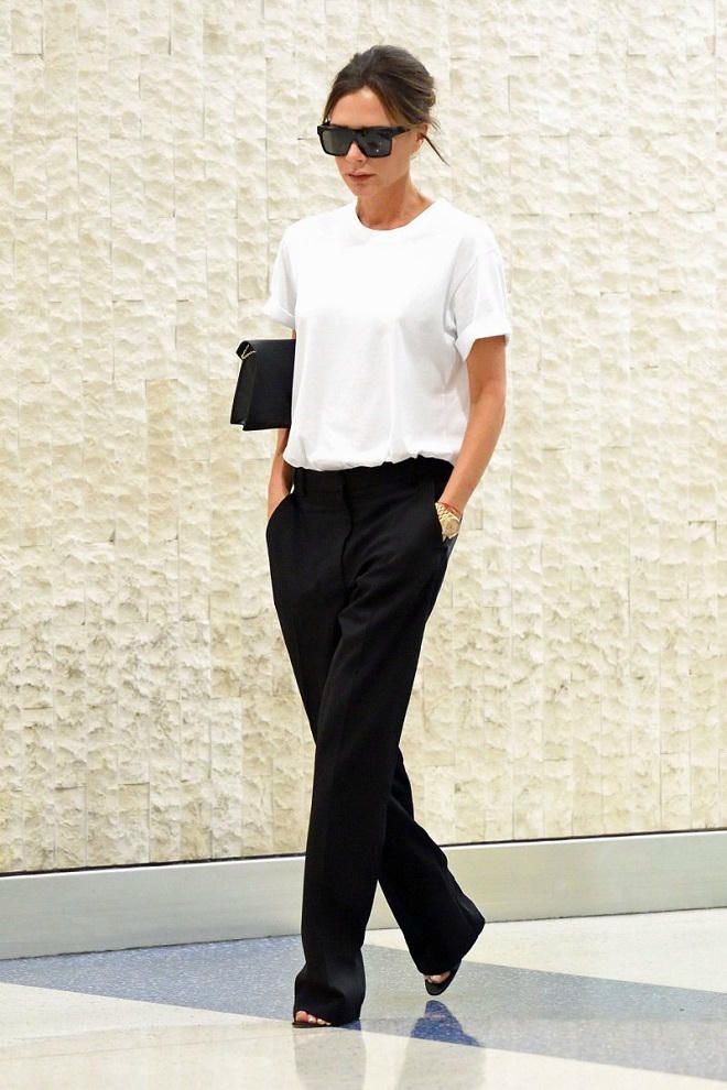 Áo thun + quần tây: Menswear là phong cách lấy cảm hứng từ trang phục của nam giới. Đây là cách để phái nữ thể hiện cá tính, tiếng nói của bản thân bằng ngôn ngữ thời trang. Victoria Beckham chính là biểu tượng về sự nữ quyền. Trang phục cô diện thường toát lên vẻ mạnh mẽ dành cho các cô gái hiện đại. Áo thun phối cùng quần tây ống suông là gợi ý thú vị từ cựu thành viên Spice Girls cho phái nữ trong ngày 8/3.