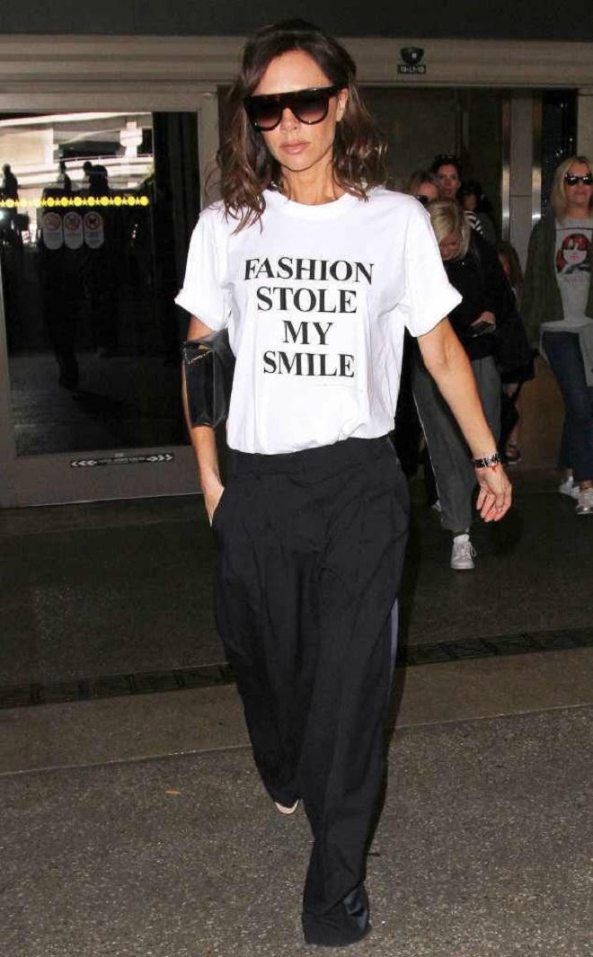 Sơ mi + quần tây: Đây là công thức quen thuộc của người đẹp mỗi khi xuống phố. Sự thanh lịch, mạnh mẽ chính là yếu tố quan trọng trong phong cách thời trang của Victoria Beckham. Nhà thiết kế luôn lựa chọn sơ mi cùng quần tây ống suông với những gam màu trung tính như trắng, đen hay xám.