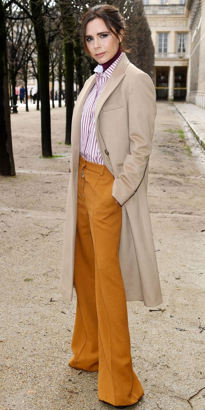 Áo khoác dáng dài tông màu trung tính kết hợp cùng sơ mi kẻ sọc và quần tây ống suông nổi bật trở thành gợi ý thú vị của cựu thành viên Spice Girls. Nếu muốn thay đổi bản thân chút đỉnh trong ngày 8/3, phái nữ có thể học hỏi theo phong cách thời trang của nhà thiết kế Victoria Beckham.
