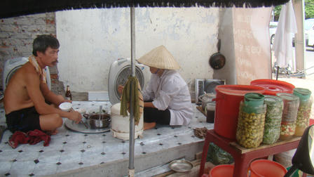 Gần một năm nay, vợ chồng anh Nguyễn Ngọc Thành (SN 1957, nhà số 12C, Thanh Bảo, Kim Mã) đã ăn cơm ngoài trời như thế. Ngôi nhà 4 tầng x 13m2 của anh đã “bay” hết khi giải tỏa, nay chỉ còn 6m2.