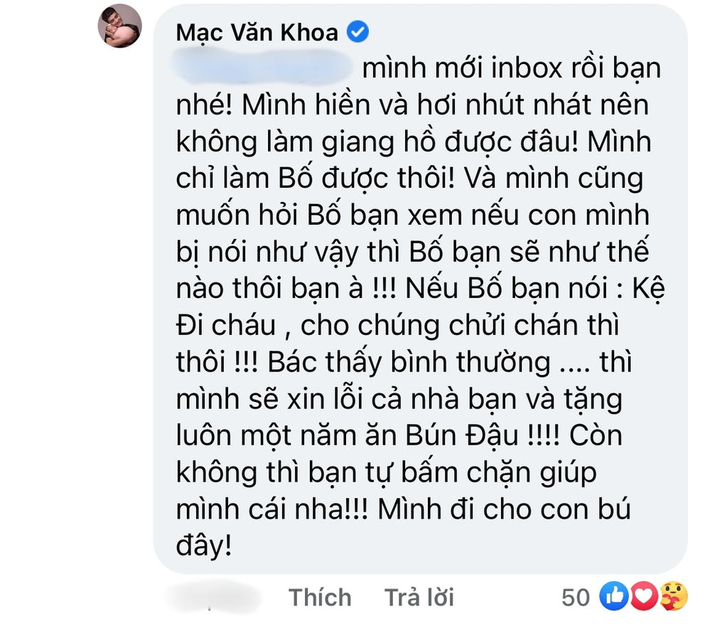 Mạc Văn Khoa lên tiếng. Nam diễn viên hài thẳng thắn nhắn tin trực tiếp vào tài khoản anti-fan: "Mình mới inbox rồi bạn nhé. Mình hiền và hơi nhút nhát nên không làm giang hồ được đâu. Mình chỉ làm bố được thôi".