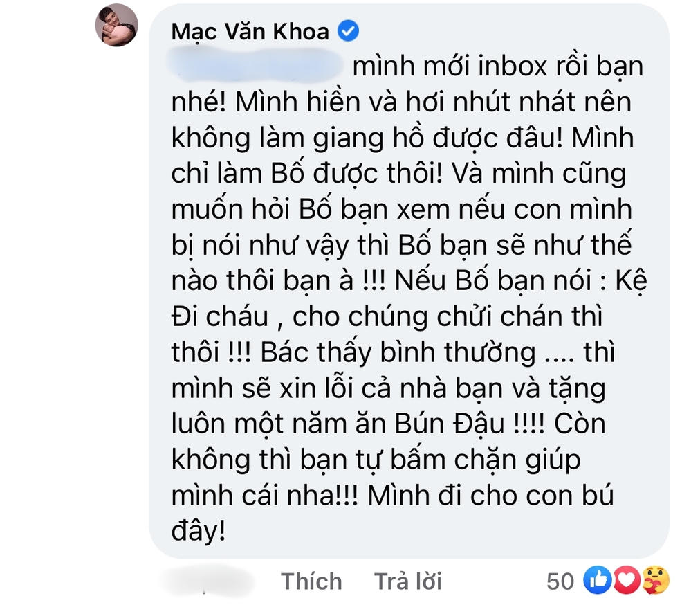 Bên cạnh đó, anh còn rất khéo léo khi nhắc đối phương hãy hỏi bố người ấy về hành động mà bạn vừa thực hiện với một bé gái 5 tháng tuổi. Mạc Văn Khoa nói: "Mình cũng muốn hỏi bố bạn xem nếu con mình bị nói như vậy thì bố bạn sẽ như thế nào? Nếu bố bạn nói: Kệ đi cháu, cho chúng chửi chán thì thôi, bác thấy bình thường... Thì mình sẽ xin lỗi cả nhà bạn. Còn không bạn tự bấm nút chặn giúp mình cái nha. Mình đi cho con bú đây".