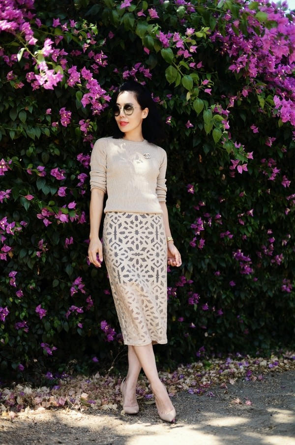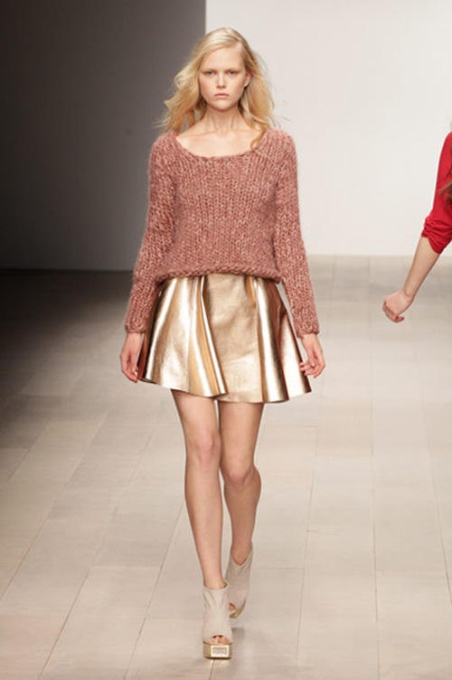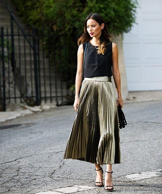 Hầu hết những chân váy có khả năng bắt sáng tốt như metallic và sequin thì bạn nên chọn những chiếc áo đơn sắc và tối màu để kết hợp. Hoặc bạn có thể diện theo ton-sur-ton màu sắc tạo hiệu ứng lan tỏa từ nhạt đến đậm hoặc ngược lại như thế này.