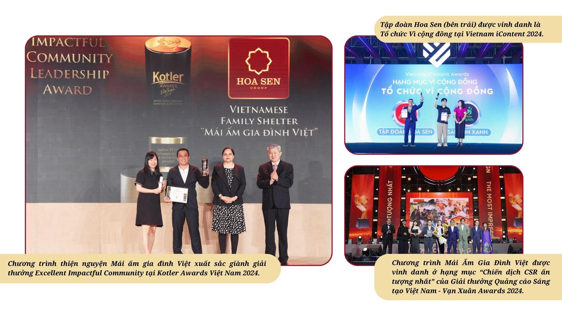 Và gần đây nhất, chương trình Mái ấm gia đình Việt tiếp tục được vinh danh ở hai hạng mục “Thương hiệu sáng tạo được yêu thích nhất” và “Chiến dịch CSR ấn tượng nhất” tại Lễ trao giải Quảng cáo Sáng tạo Việt Nam năm 2024.