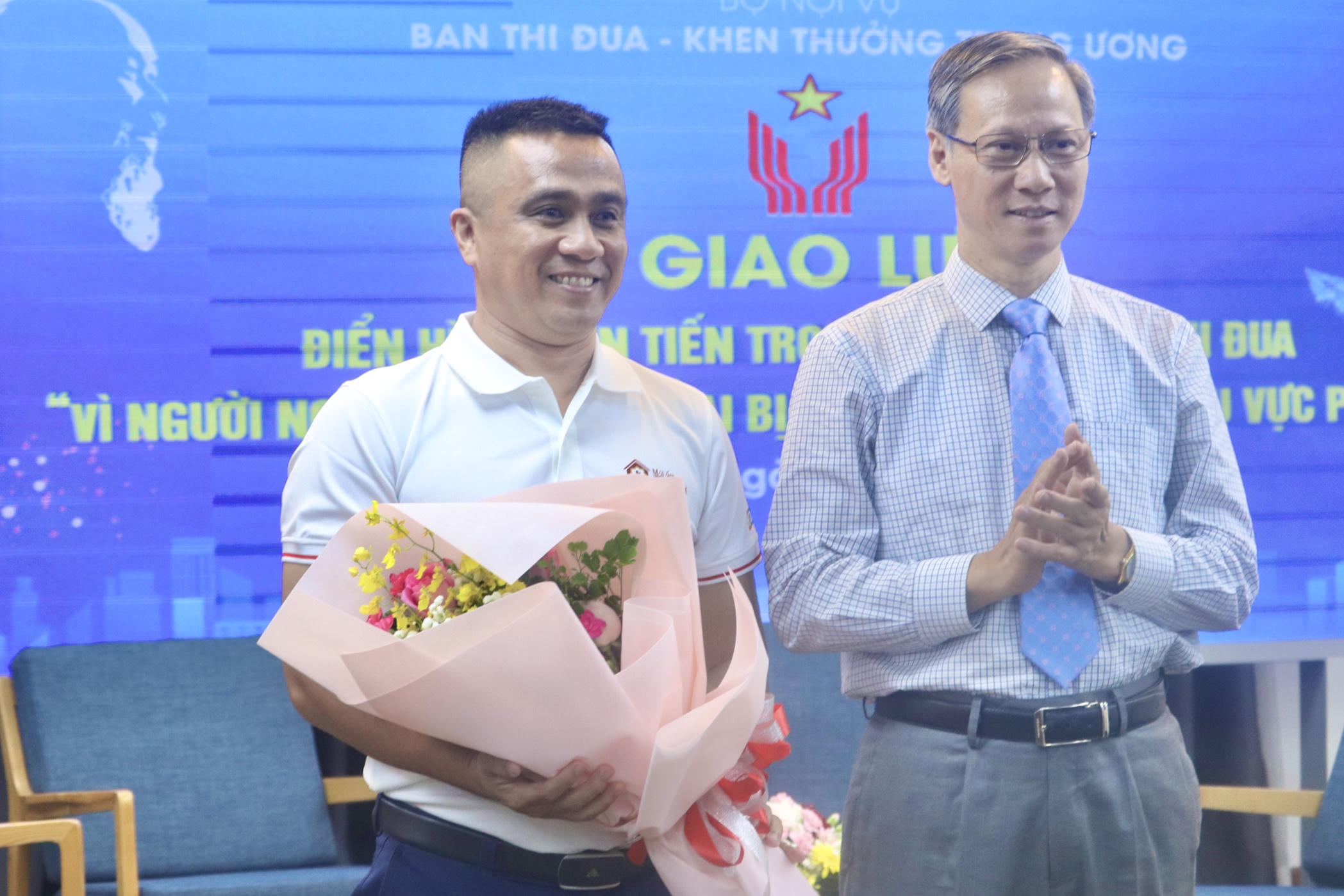 | Ông Phan Văn Hùng, Phó Trưởng ban Thường trực Ban Thi đua - Khen thưởng Trung ương (bên phải) chúc mừng đại diện Tập đoàn Hoa Sen tại buổi giao lưu. |