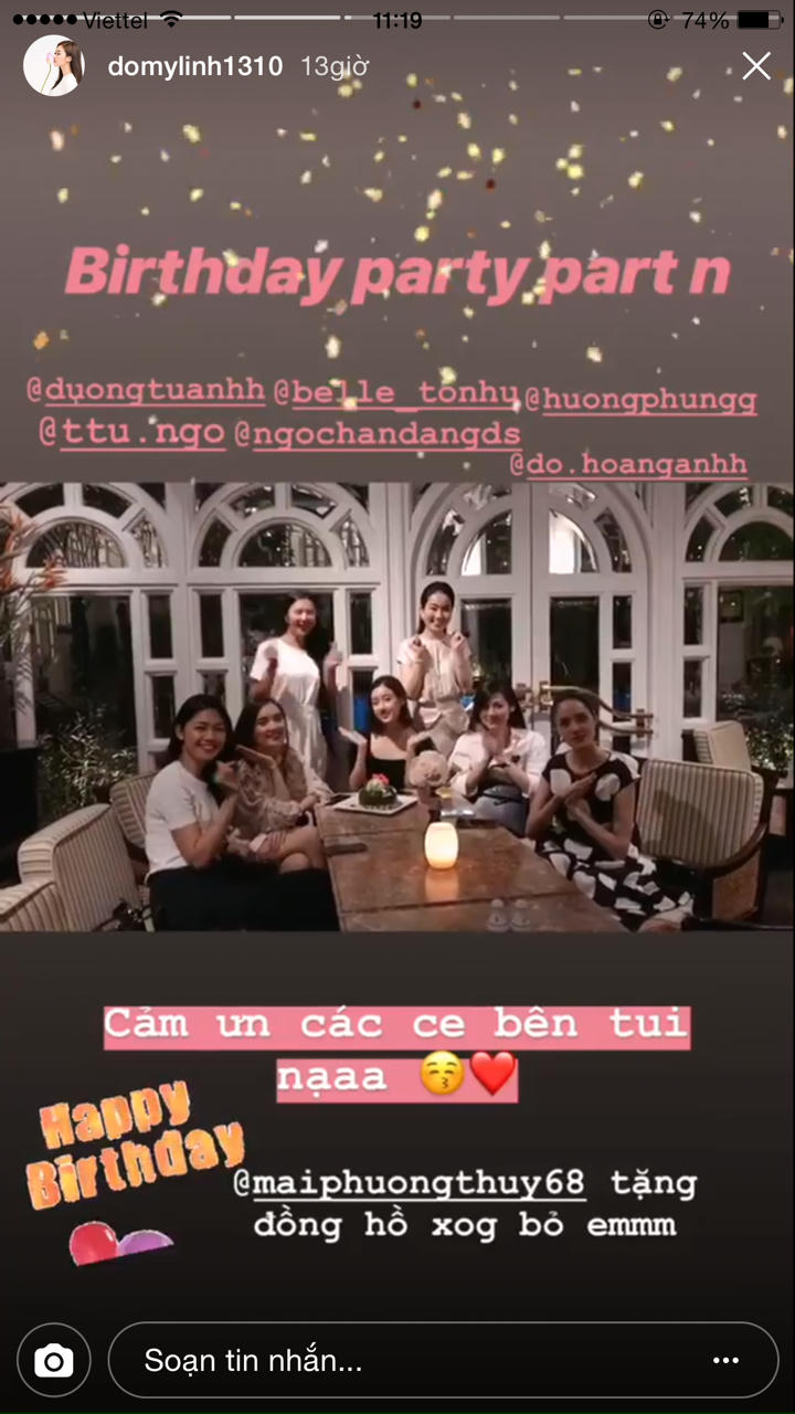 Bữa tiệc sinh nhật có sự góp mặt của Hoa hậu Kỳ Duyên, Hoa hậu Ngọc Hân, Hoa hậu Mai Phương Thúy, Á hậu Tú Anh, và một số người bạn thân thiết của Đỗ Mỹ Linh.