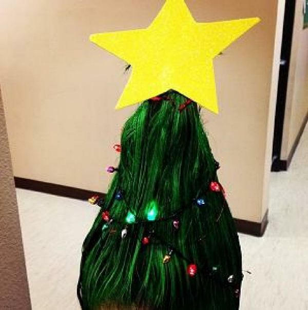 Sau đó, bạn phun keo xịt màu xanh lá cây lên tóc. Thêm chút đồ trang trí, đèn dây, kim tuyến hoặc cả ngôi sao trên đầu sao cho cuốn hút nhất.