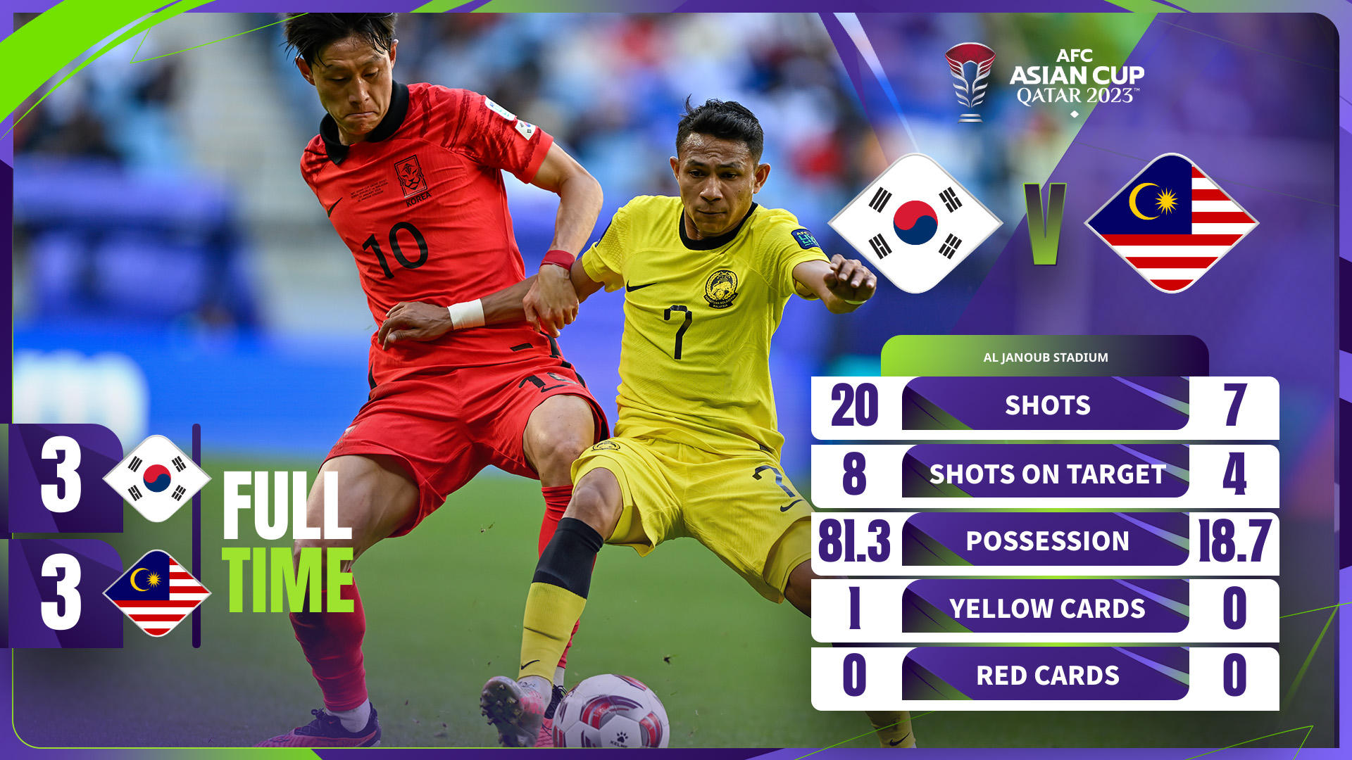 Tưởng chừng như trận đấu sẽ kết thúc với tỷ số hòa thì ở phút bù giờ thứ hai, trọng tài xem lại VAR và xác định Oh Hyeon Gyu bị phạm lỗi trong vòng cấm nên cho Hàn Quốc hưởng quả 11m. Son Heung Min đã ghi bàn thắng nâng tỷ số 3-2. Với màn rượt đuổi đầy tính kịch trước đó thì sẽ không bất ngờ khi Malaysia có thêm bàn thắng trong 10 phút bù giờ còn lại.
