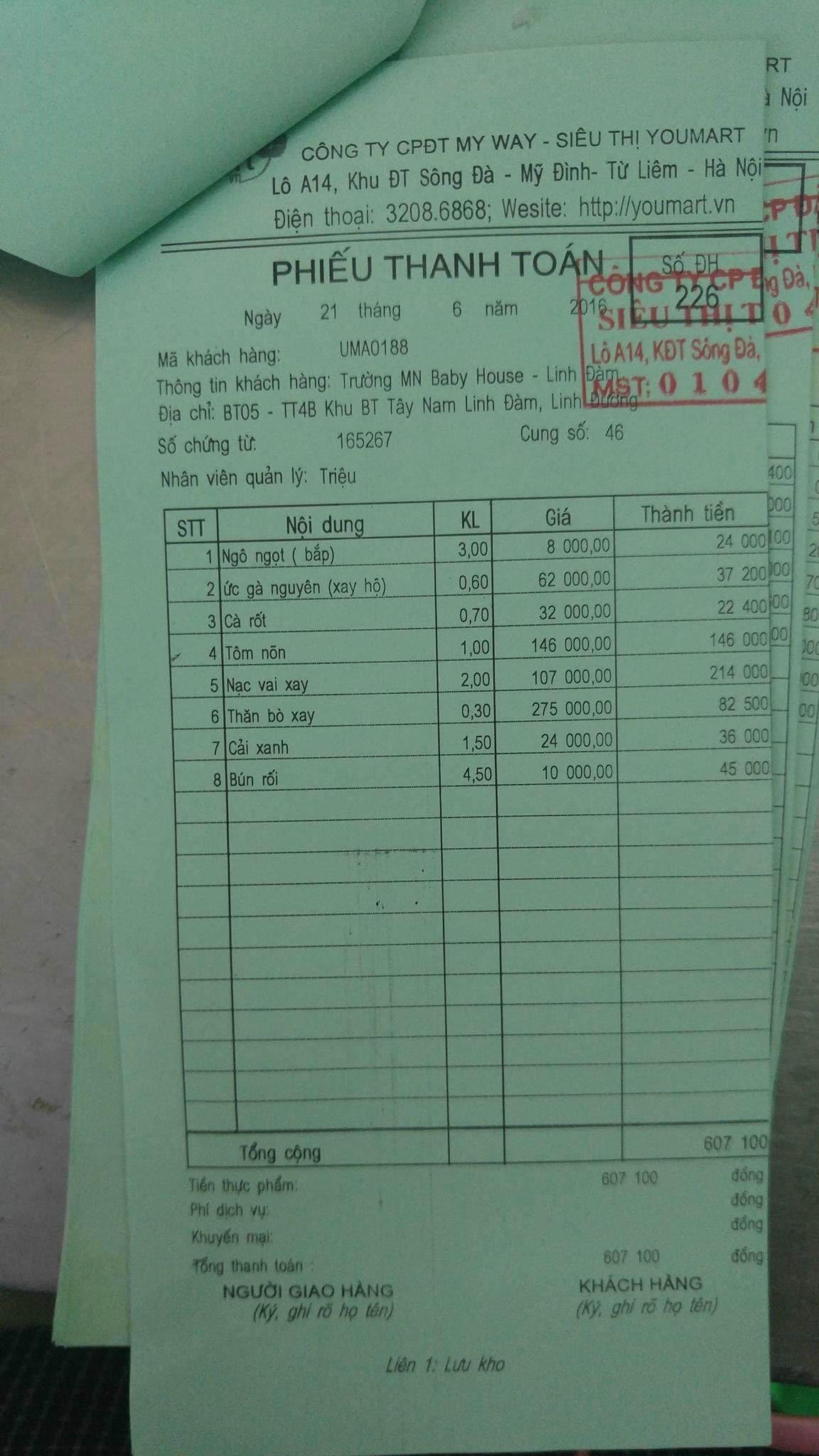 Về thông tin “trường dùng 4 lạng thịt để cho hơn 100 bé ăn…”, chị Phan Thị Thúy, đại diện trường mầm non Baby’s House cung cấp hóa đơn mua bán và cho biết, trường có ký kết với Công ty TNHH thực phẩm Phú Thiên Tân làm đầu mối cung cấp thực phẩm. Tuy nhiên, theo tìm hiểu của phóng viên, trường mầm non Baby’s House còn lấy thực phẩm từ siêu thị Youmart và điều đáng nói ở đây là hóa đơn trị giá hơn 600.000 đồng với số thực phẩm ít ỏi.