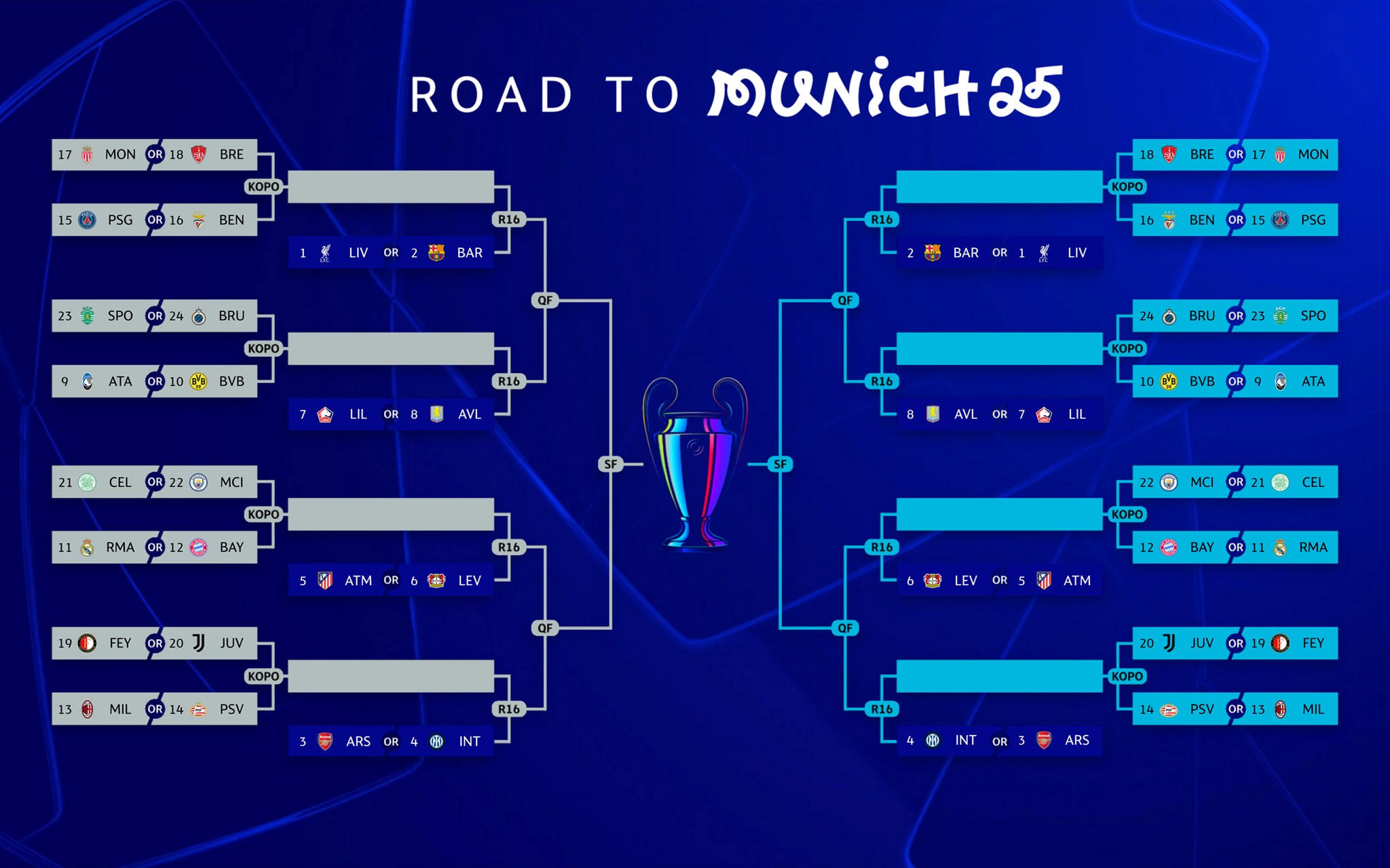 16 CLB dự vòng play-off có Atalanta, Dortmund, Real Madrid, Bayern Munich, AC Milan, PSV, PSG, Benfica, Monaco, Brest, Feyenoord, Juventus, Celtic, Man City, Sporting Lisbon và Club Brugge.