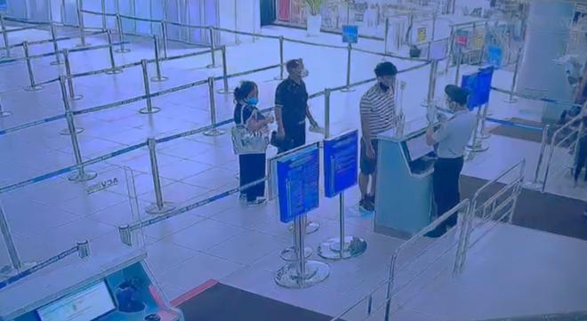 Hai đối tượng Bình và Hồng (quần áo màu tối) đang làm thủ tục tại sân bay Cam Ranh đi Hà Nội sau khi thực hiện vụ lừa đảo tại Nha Trang. |