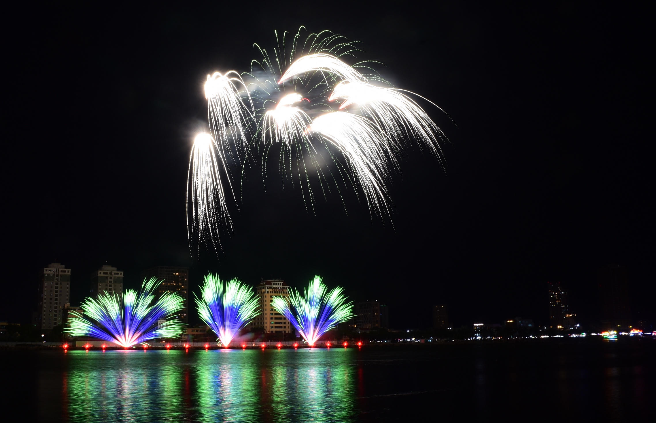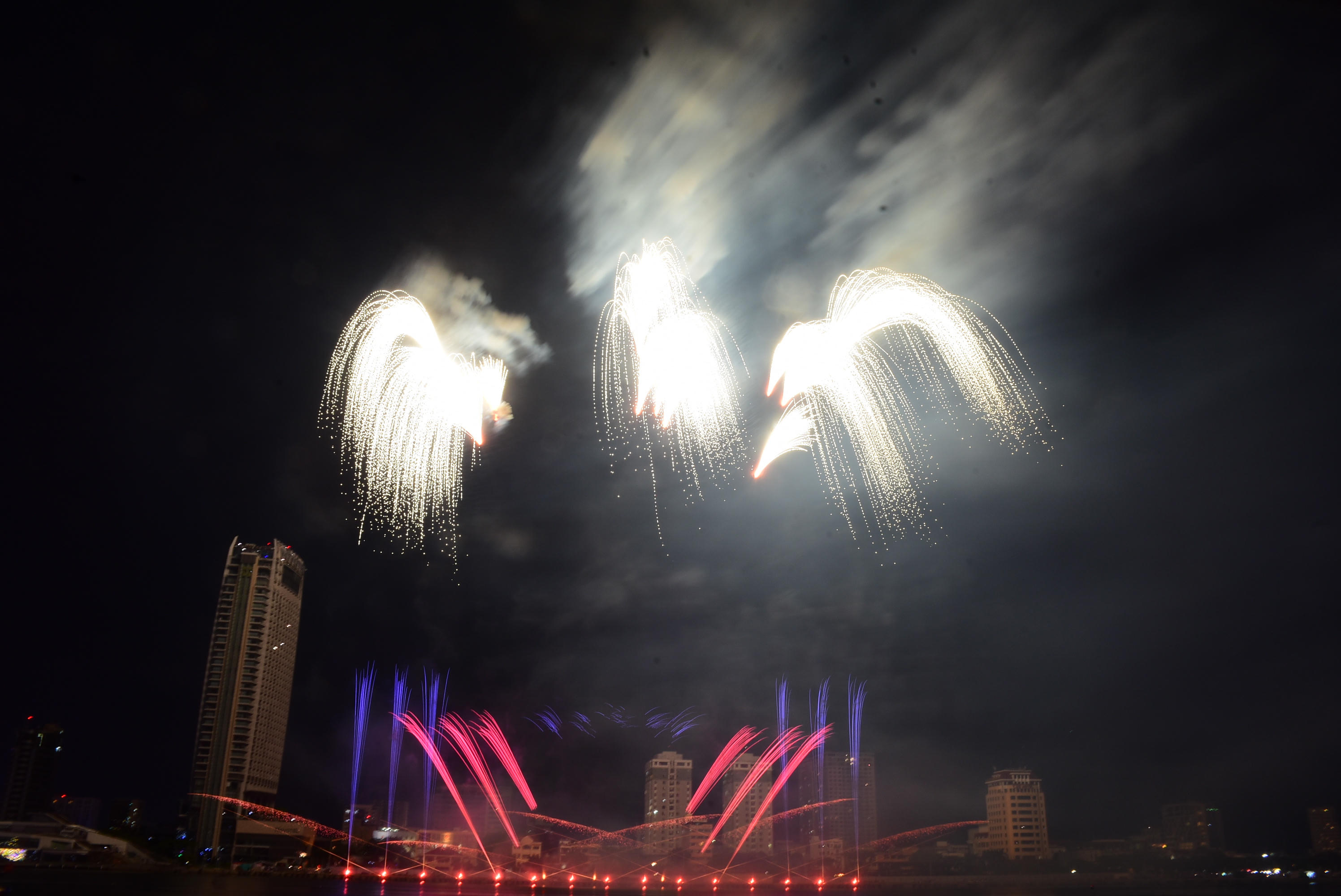Trong khi đó, lúc những âm thanh cuồng nhiệt của những bản nhạc rock nổi lên cũng là lúc bầu trời sông Hàn bùng lên những thác ánh sáng lung linh trong một bản giao hưởng đầy màu sắc đến từ đội JoHo Pyro của Phần Lan, tạo ra những chùm hoa văn ánh sáng đầy mê hoặc.