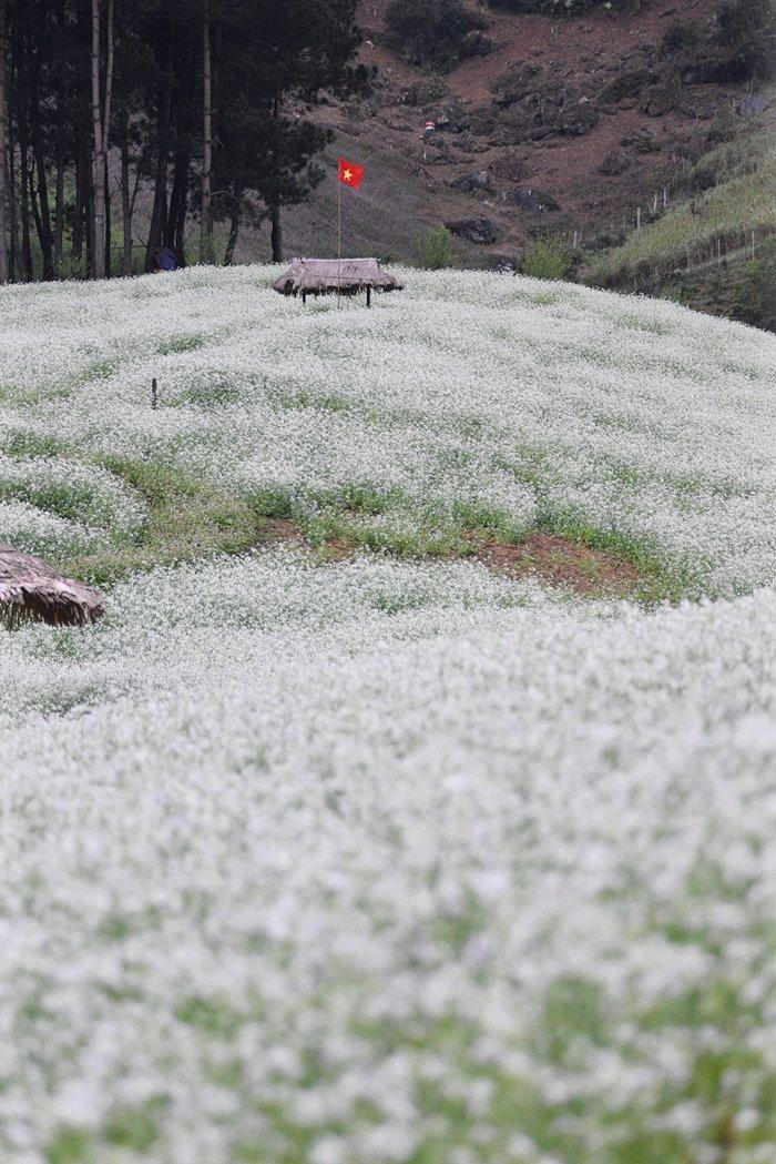 Những bông hoa tam giác mạch nở thành chùm, cánh hoa nhỏ li ti chụm lại thành hình chóp nón, mang vẻ đẹp mộc mạc, giản dị riêng có của vùng cao, níu chân những du khách ghé thăm. |
