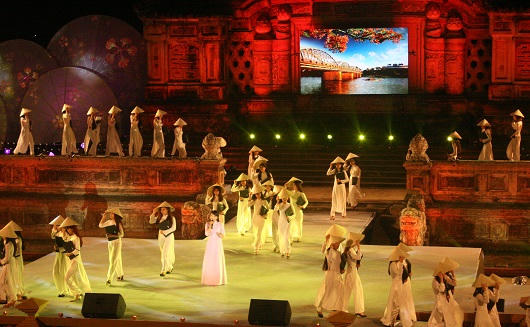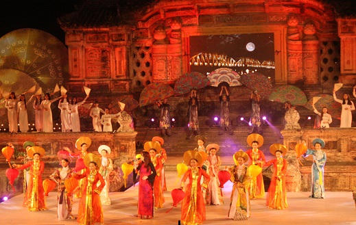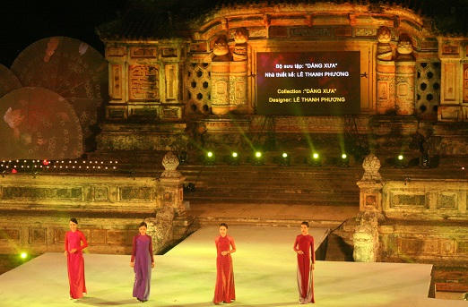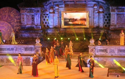 Cùng với nghệ thuật ánh sáng, những tà áo dài dường như thêm lung linh trong sự mênh mang của những giai điệu đậm chất Huế do nhiều ca sỹ nổi tiếng như Quang Linh, Vân Khánh, Quý Hảo…thể hiện.
