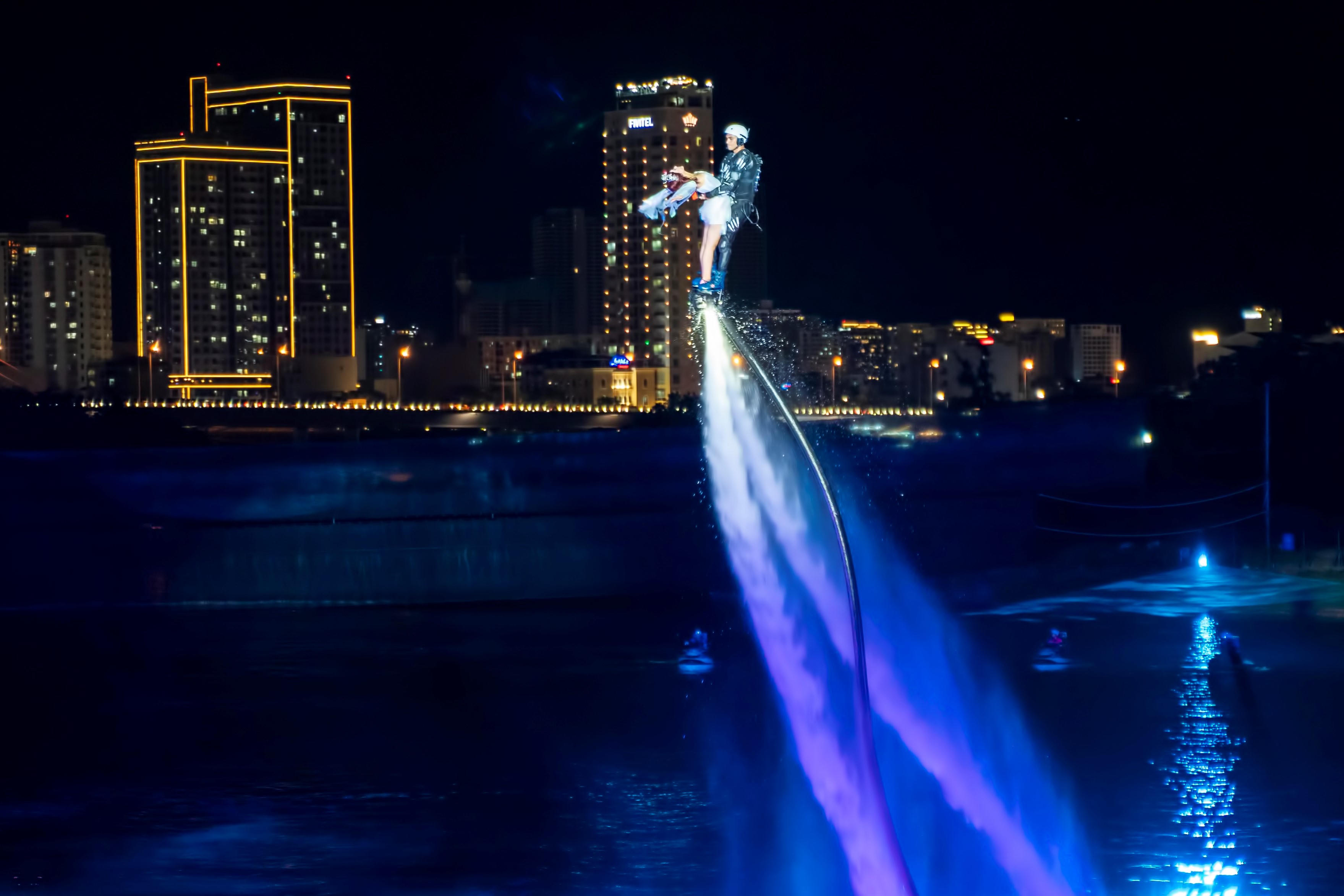 Bước vào chương "Ánh sáng" của show diễn, du khách sẽ được chiêm ngưỡng những vòng xoáy Flyboard vẽ lên không trung bức họa của nước và ánh sáng. |