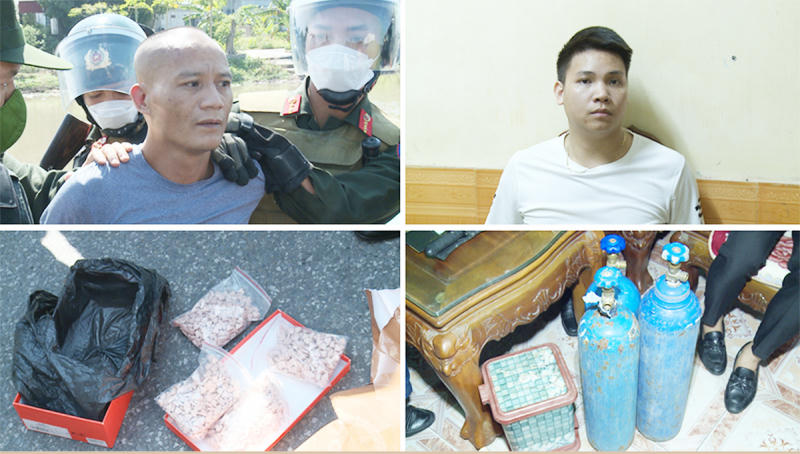 Tiến hành khám xét trên người và nơi ở của đối tượng, lực lượng Công an thu giữ 1,1kg ma túy tổng hợp; 1 cân điện tử; 6 bình đựng khí N2O; 3 điện thoại di động.