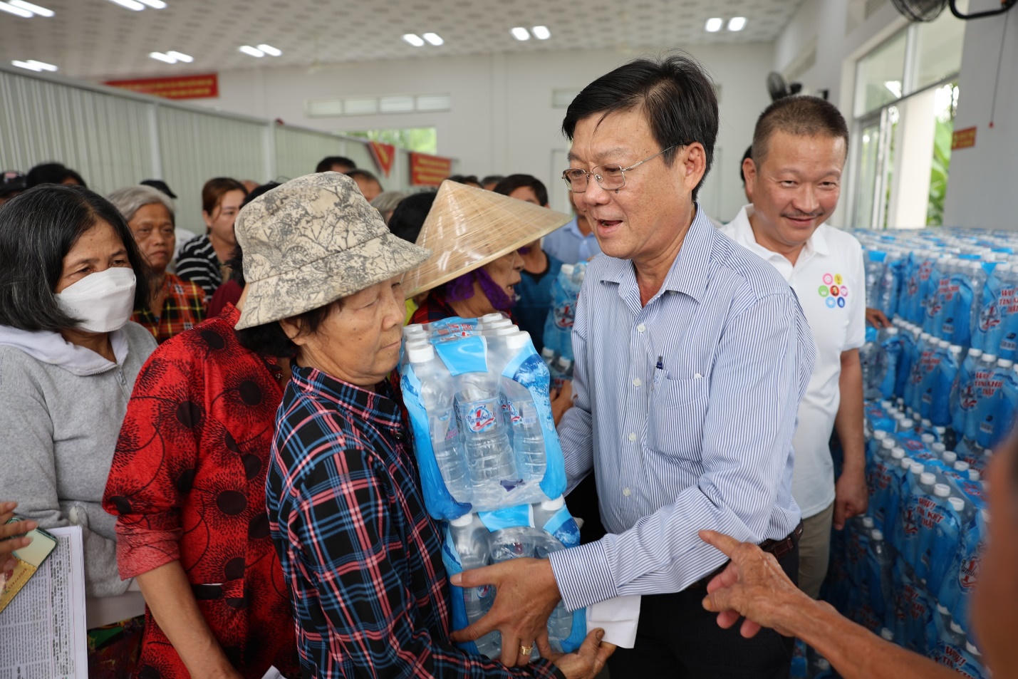 Ông Nguyễn Duy Hưng, đại diện Công ty Tân Hiệp Phát hỏi thăm và chia sẻ với người dân xã Vĩnh An, Châu Thành, Bến Tre. |