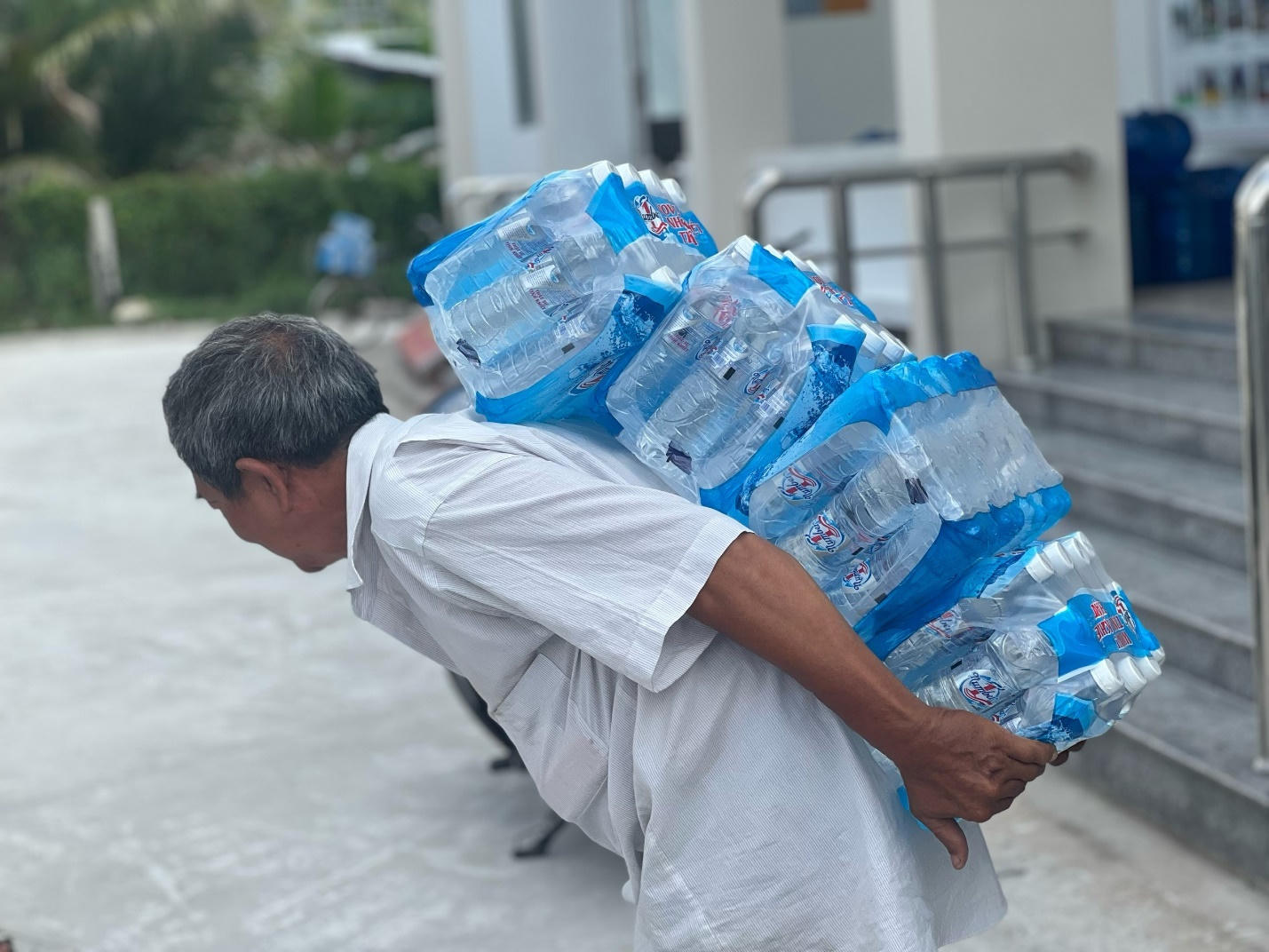 Một người dân “cõng” nước về nhà từ chương trình “Giọt nước nghĩa tình lần 2 năm 2024”. |
