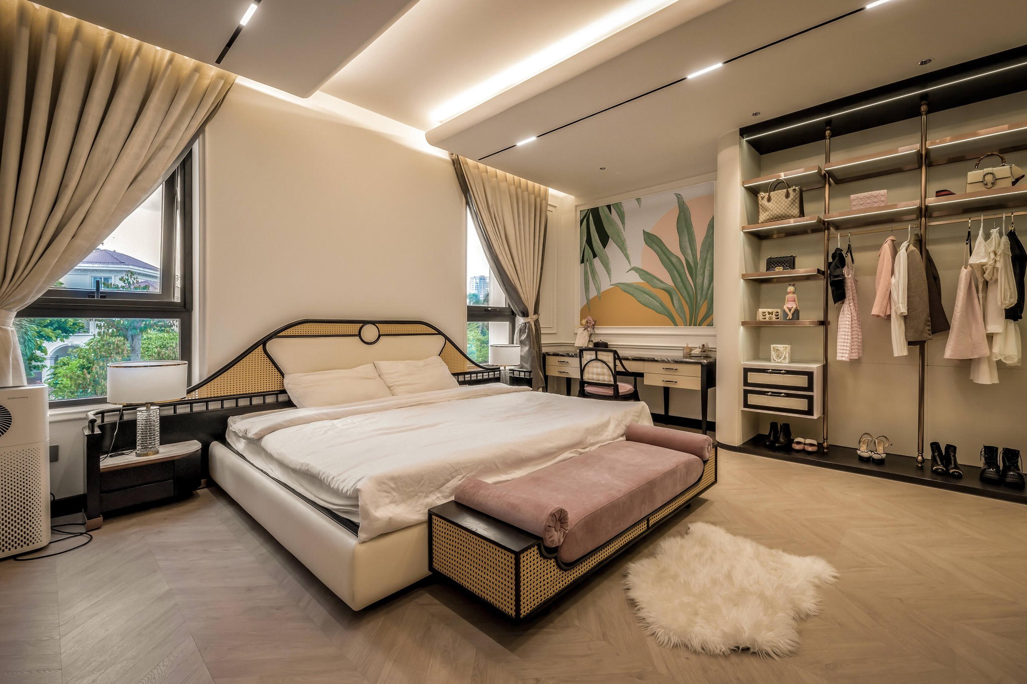 Bàn trang điểm và kệ đựng đồ một cách hài hòa, sang trọng. |