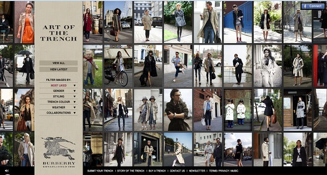 Ngoài ra, trong nỗ lực cạnh tranh trên mạng xã hội, Burberry còn lập ra một tiểu trang gọi là “Art of the Trench” có kết nối trực tiếp với đường dẫn trên Facebook để giới thiệu một loạt hình ảnh trang phục được mặc trên đường phố. Trên một số ứng dụng, khách hàng có thể đặt mua ngay trang phục mà họ mới nhìn thấy trên sàn catwalk.