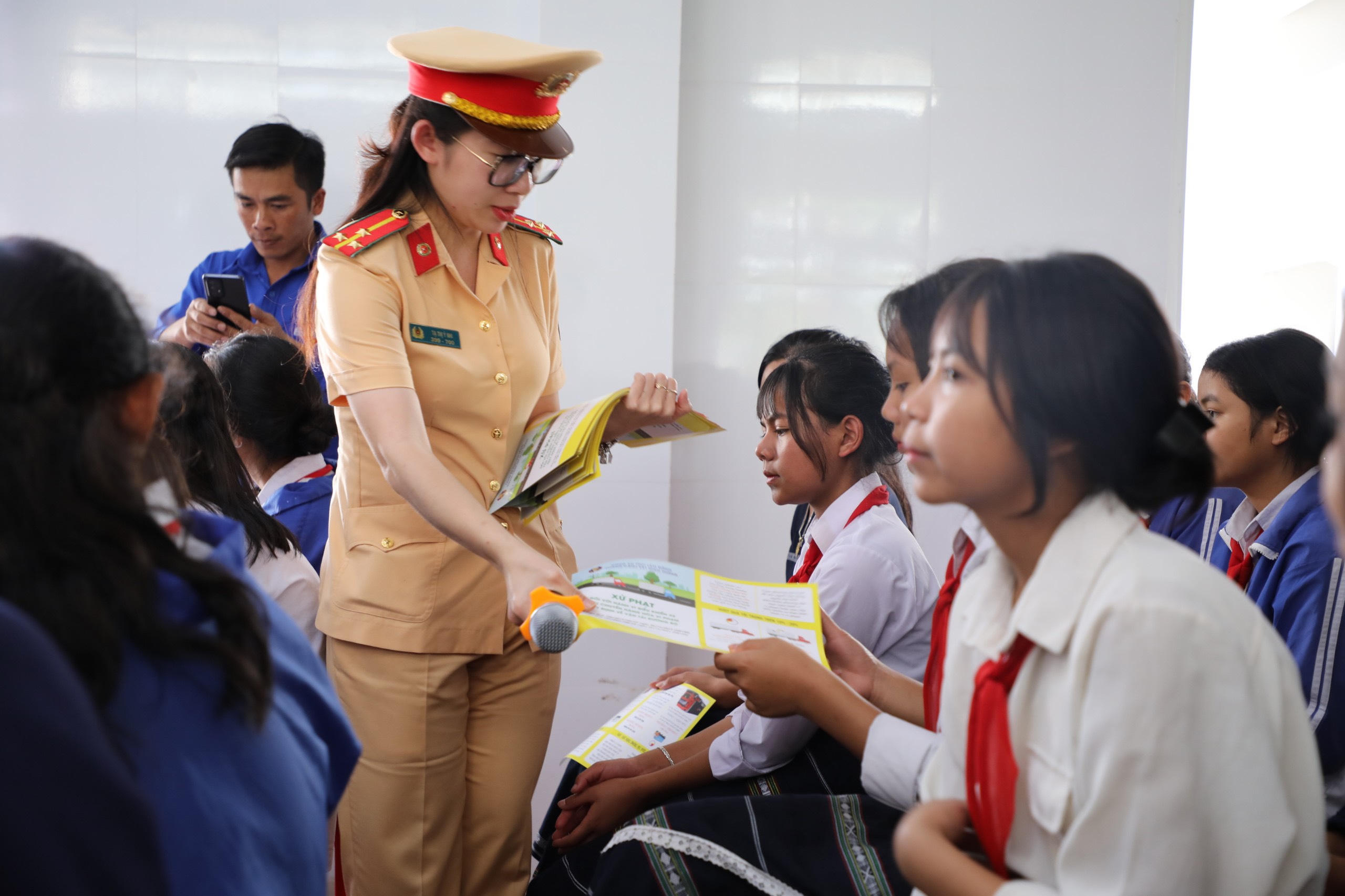 Chiến sĩ CSGT phát tờ rơi tuyên truyền luật giao thông đường bộ cho học sinh trường Phổ thông dân tộc nội trú – THCS Đơn Dương. |