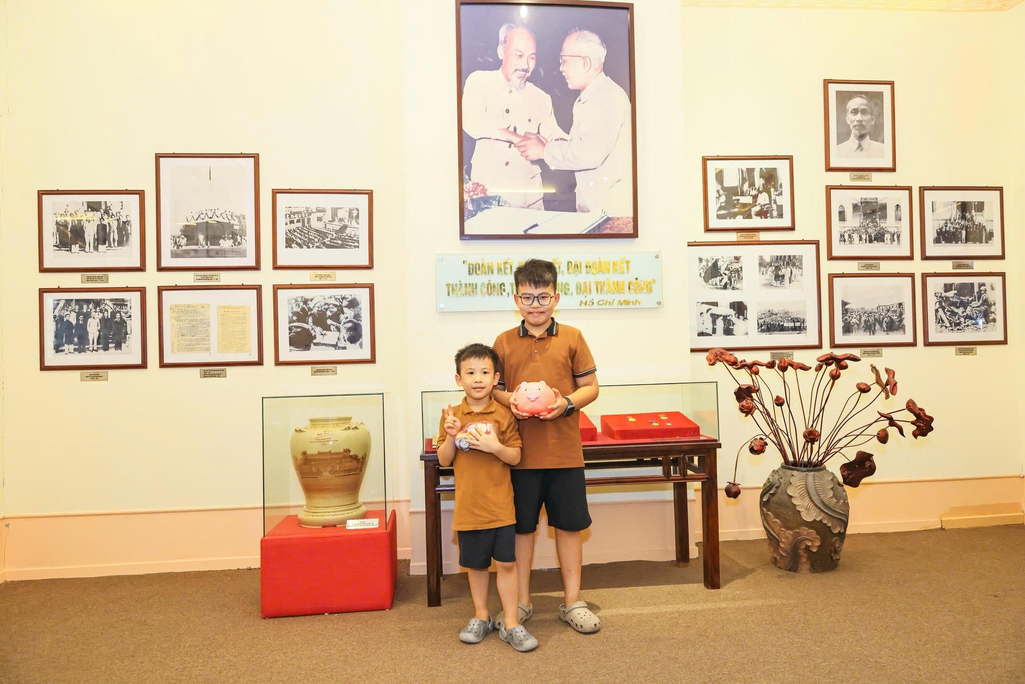 Hai em Lê Gia Tú (10 tuổi) và em Lê Hải Lâm (5 tuổi) đem số tiền tiết kiệm được trong lợn đất tới Mặt trận Tổ quốc Việt Nam để gửi tới đồng bào bị lũ lụt. (Ảnh: MTTQ Việt Nam). |