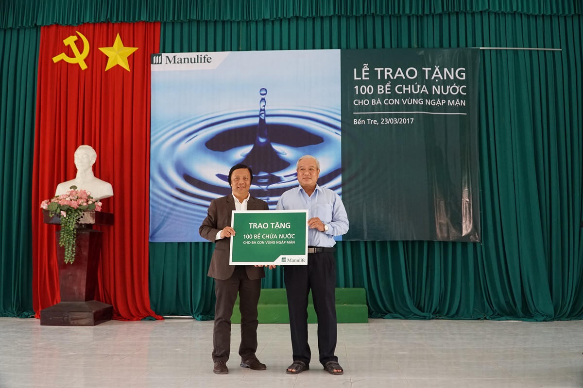 Chương trình tài trợ bể chứa nước ngọt cho bà con vùng ngập mặn được Manulife Việt Nam và Báo Công An TP. Hồ Chí Minh phối hợp thực hiện từ cuối năm 2016. Sau thời gian chuẩn bị, 100 bể chứa nước với sức chứa 2.000 lít/bể được xây kiên cố bằng bê tông đã được bàn giao và đưa vào sử dụng tại các vùng ngập mặn tại Bến Tre như xã Phước Mỹ Trung, Tân Phú Tây, Nhuận Phú Tân và Hưng Khánh Trung A. Đây sẽ là nguồn dự trữ cung cấp nước ngọt sinh hoạt cho bà con quanh năm, giúp bà con cải thiện chất lượng cuộc sống và ổn định phát triển kinh tế.