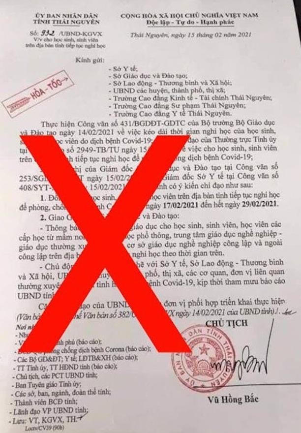 Mới đây, trên mạng xã hội lan truyền bức ảnh chụp văn bản của UBND tỉnh Thái Nguyên ban hành cùng ngày do ông Vũ Hồng Bắc, chủ tịch UBND tỉnh ký quyết định cho học sinh, sinh viên trên địa bàn nghỉ học để phòng chống dịch COVID-19.