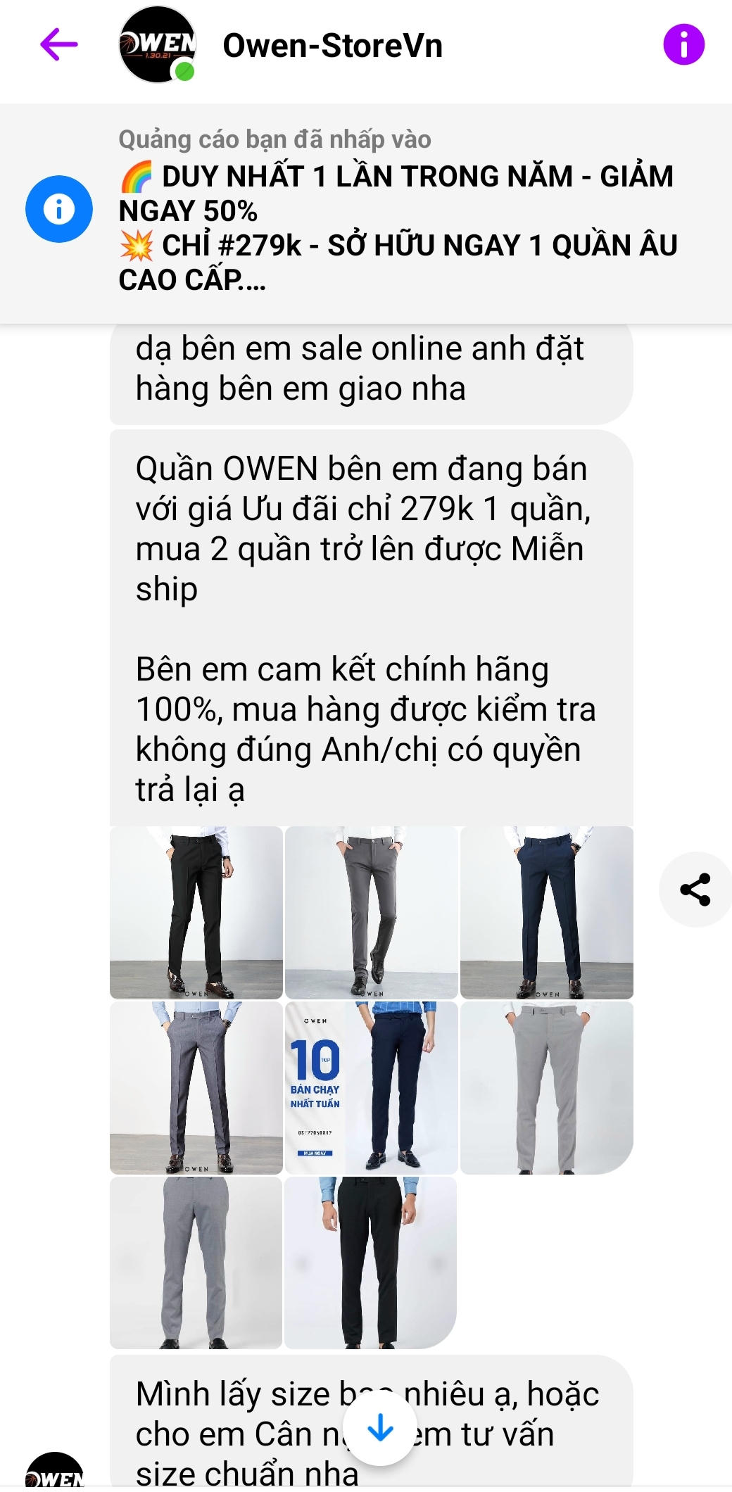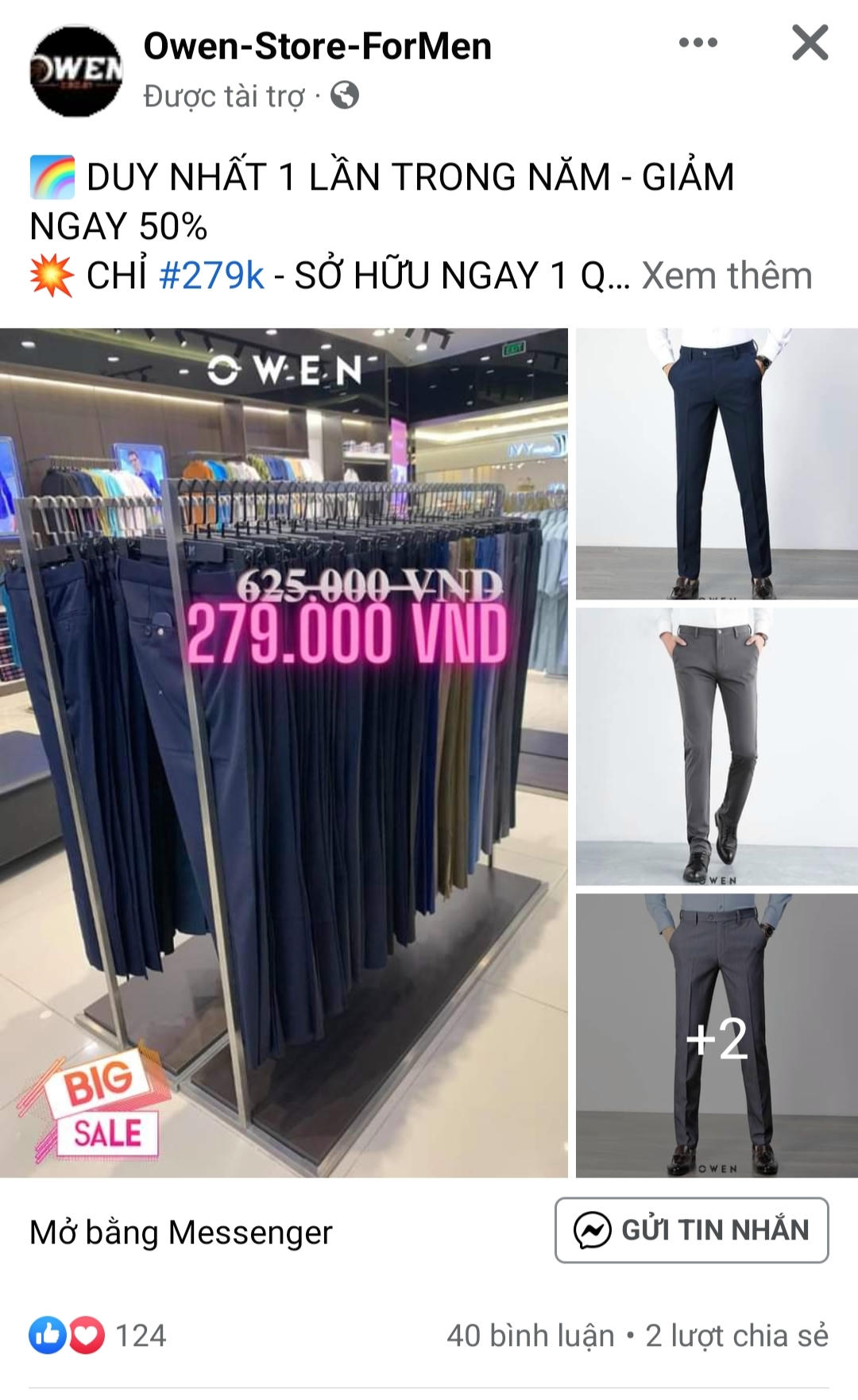 Tương tự, chị T.T.L thấy có chương trình khuyến mãi của Owen tới 50% cũng đã liên hệ qua mạng xã hội Facebook để mua quần cho chồng.