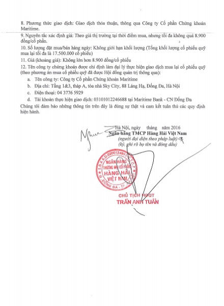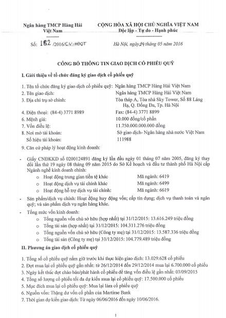 Maritime Bank: Công bố thông tin giao dịch cổ phiếu quỹ (PLO) - Công bố thông tin giao dịch mua cổ phiếu quỹ của Ngân hàng TMCP Hàng Hải Việt Nam Thứ Tư 25/05/2016 17:29 (GMT+7)