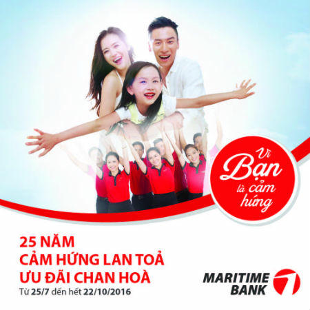 (PLO) - Mừng sinh nhật 25 năm và thay lời tri ân tới khách hàng, từ ngày 25/7 – 22/10/2016, Maritime Bank triển khai chương trình “Cảm hứng lan tỏa, Ưu đãi chan hòa” với 60.000 giải thưởng dành tặng ngay cho khách hàng giao dịch tại quầy, nhiều cơ hội nhận hoàn tiền tới 100% mỗi ngày cùng những giải thưởng may mắn hàng tháng và cuối chương trình.