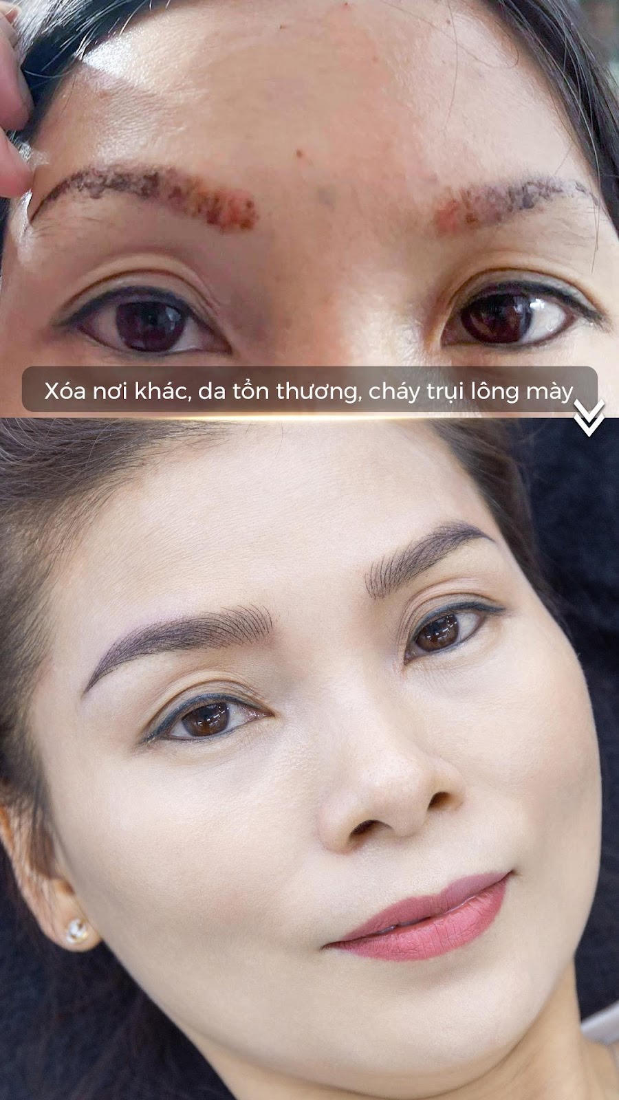 Chị Ánh tại Hà Nội làm mày không ưng ý, đi xóa sửa nơi khác bị cháy sẹo, bỏng rộp. Chị chia sẻ mỗi lần bắn xóa mực ở chỗ cũ bị sốt. Và cuối cùng bỏ dở liệu trình vì quá đau nhưng vẫn chưa sạch mực. Đến với DK Eyesbrow & Beauty thì quá trình xóa sửa nhẹ nhàng và chị đã tìm lại được dáng mày ưng ý tại đây.