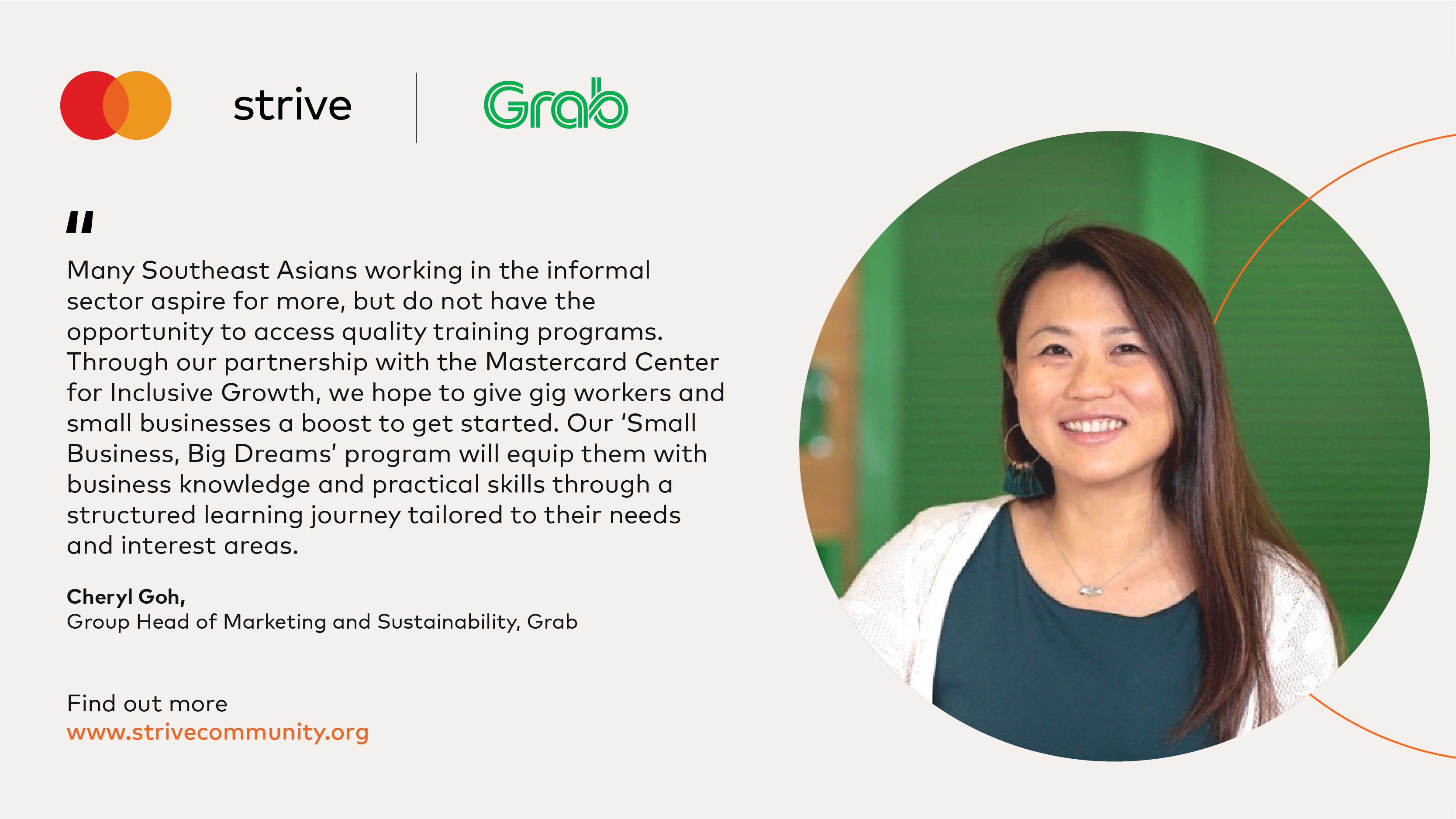 Bà Cheryl Goh, Phó Chủ tịch phụ trách bộ phận Tiếp thị & Phát triển bền vững, Grab cho biết:“Nhiều người dân Đông Nam Á làm việc trong khu vực phi chính thức mong muốn đạt được nhiều hơn, nhưng thực tế, nhiều người trong số họ không có phương tiện hoặc cơ hội để tiếp cận các chương trình đào tạo có chất lượng. Thông qua quan hệ đối tác với Trung tâm Phát triển Toàn diện Mastercard, chúng tôi hy vọng sẽ tiếp thêm cho người lao động trong nền kinh tế số và các doanh nghiệp nhỏ động lực để bắt đầu. Chương trình “Doanh nghiệp nhỏ, Ước mơ lớn” của chúng tôi sẽ trang bị cho họ kiến thức kinh doanh và kỹ năng thực tế thông qua một lộ trình học tập có cấu trúc phù hợp với nhu cầu và lĩnh vực mà họ quan tâm”.