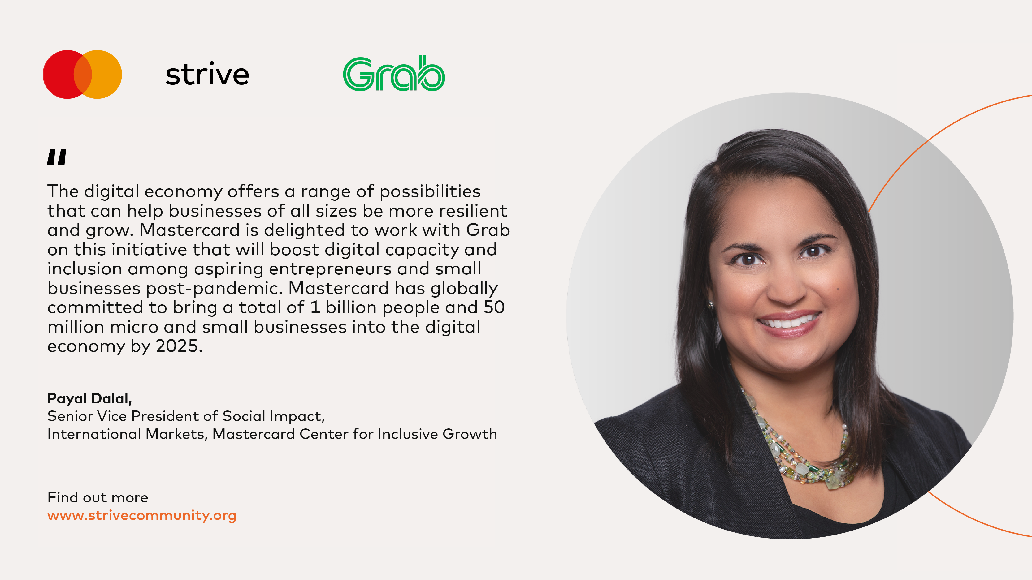 Bà Payal Dalal, Phó Chủ tịch Cấp cao phụ trách Tác động Xã hội, Thị trường Quốc tế, Trung tâm Phát triển Toàn diện Mastercard, nhận định: “Nền kinh tế kỹ thuật số cung cấp vô vàn các khả năng và cơ hội hỗ trợ các doanh nghiệp thuộc mọi quy mô thích ứng và phát triển bền vững hơn. Mastercard rất vui mừng được hợp tác cùng Grab xây dựng sáng kiến này nhằm thúc đẩy năng lực kỹ thuật số và khả năng hội nhập cho các cá nhân có nguyện vọng khởi nghiệp và doanh nghiệp nhỏ hậu đại dịch. Mastercard cam kết hỗ trợ 1 tỷ người và 50 triệu doanh nghiệp nhỏ và siêu nhỏ trên toàn cầu tham gia vào nền kinh tế kỹ thuật số vào năm 2025. Chương trình mà chúng tôi công bố hôm nay tiếp nối thành công của Học viện Mastercard 2.0 ở Indonesia, Business Cell ở Philippines, Dự án Lương kỹ thuật số HER của BSR ở Campuchia và Sáng kiến Thắp lửa hợp tác với CARE ở Việt Nam, trao cho hàng triệu doanh nghiệp nhỏ quyền tiếp cận công nghệ, chương trình đào tạo, cố vấn và dịch vụ tài chính”.