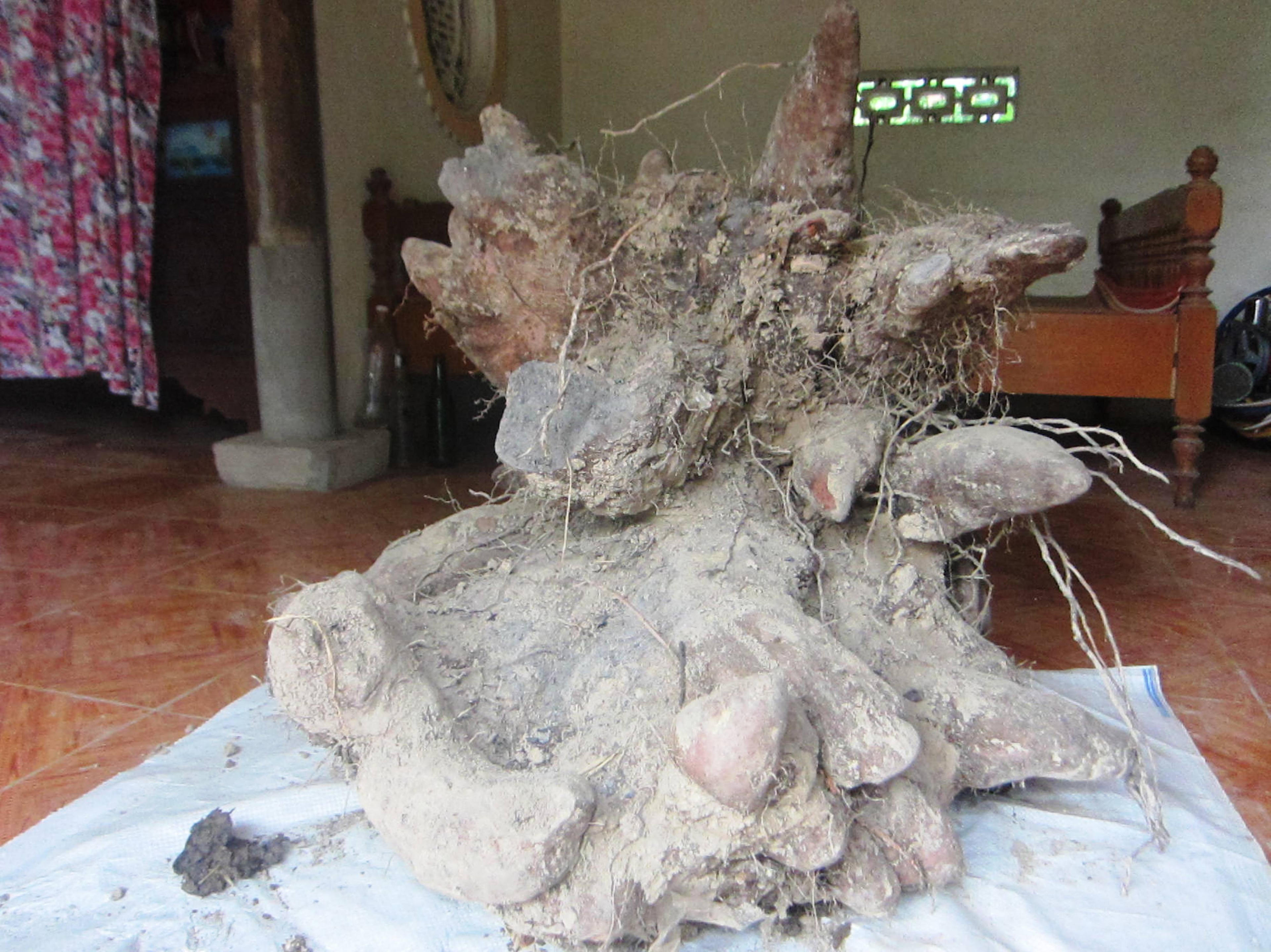 Hoảng quá, tôi vội chạy đi kêu thêm 3 người khác cùng đến phụ giúp. Càng đào sâu xuống đất, chúng tôi sững người khi thấy một hình hài lạ xuất hiện. Sau 2 tiếng đồng hồ đào, 4 người chúng tôi mới vần củ khoai ấy lên mặt đất bằng sợi dây sừng”. Chứng kiến củ khoai to, nhìn giống đầu rồng, ai nấy đều vui mừng, phấn chấn, kèm theo đó chút hoang mang.