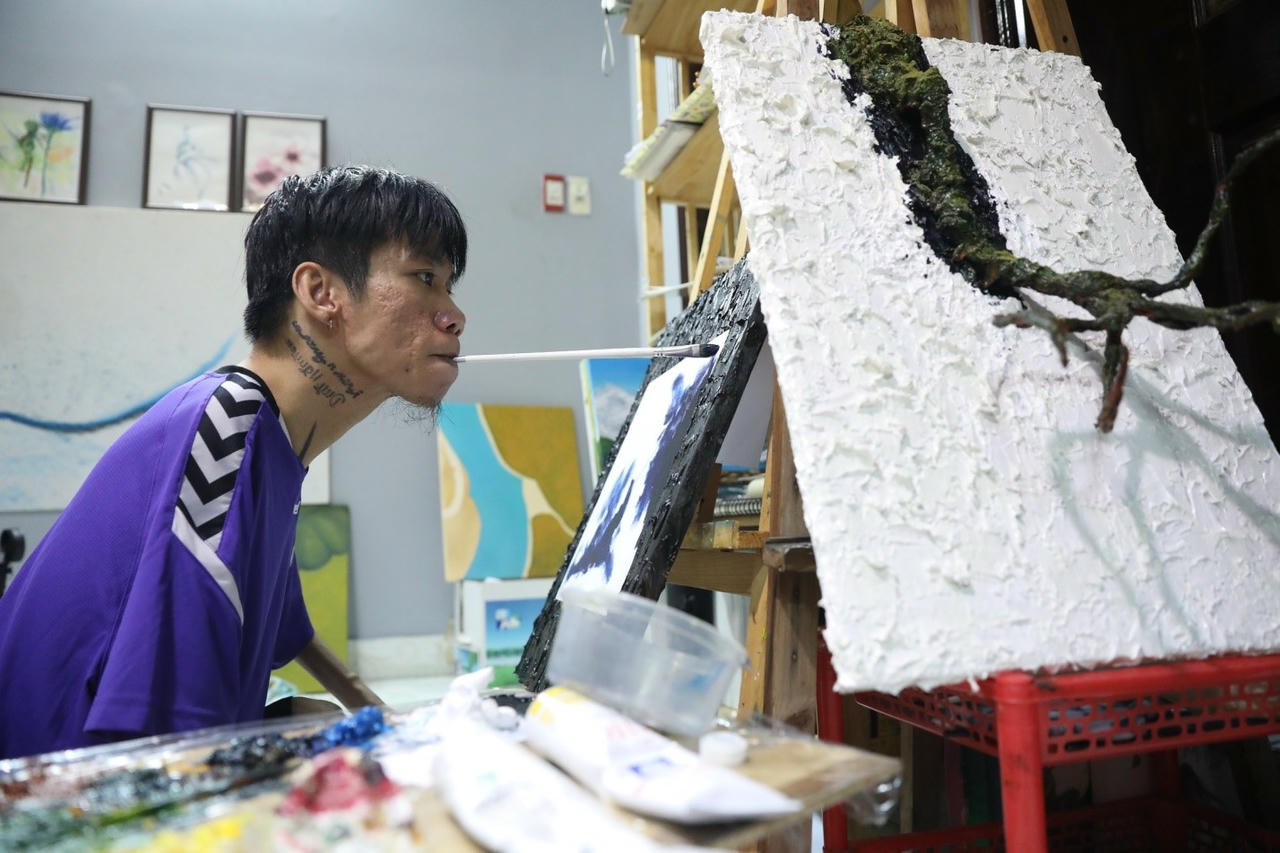 Mất hai tay, chàng họa sĩ vẽ tranh bằng miệng