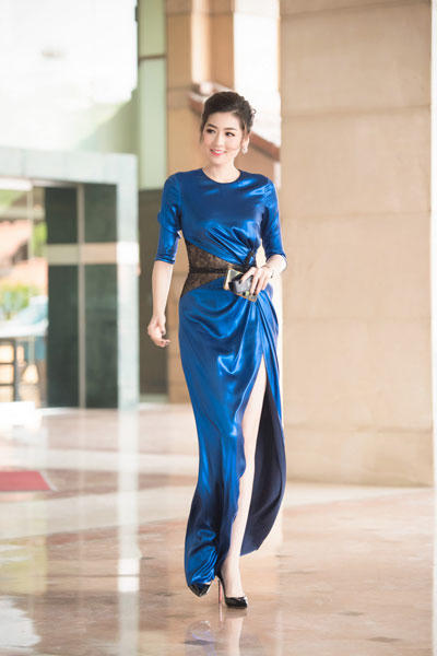 Diện trang phục màu xanh dương nổi bật của nhà thiết kế Lê Thanh Hòa, trên nền chất liệu lụa nhẹ nhàng, óng ánh, phần chi tiết xếp nếp tạo bố cục bất đối xứng kết hợp với ren mỏng, kết hợp cùng chiếc thắt lưng hình trái tim được đính kết cầu kì, tất cả đã tạo nên một thiết kế quyến rũ và sang trọng tôn lên dáng ngọc của Á hậu sinh năm 1993.