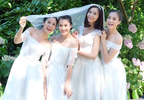 | Ngọc Hân (trái) làm phù dâu cho người mẫu Thúy Hương (thứ hai, phải). Cả hai và người mẫu Thanh Tú có một tình bạn đẹp trong làng mẫu. |