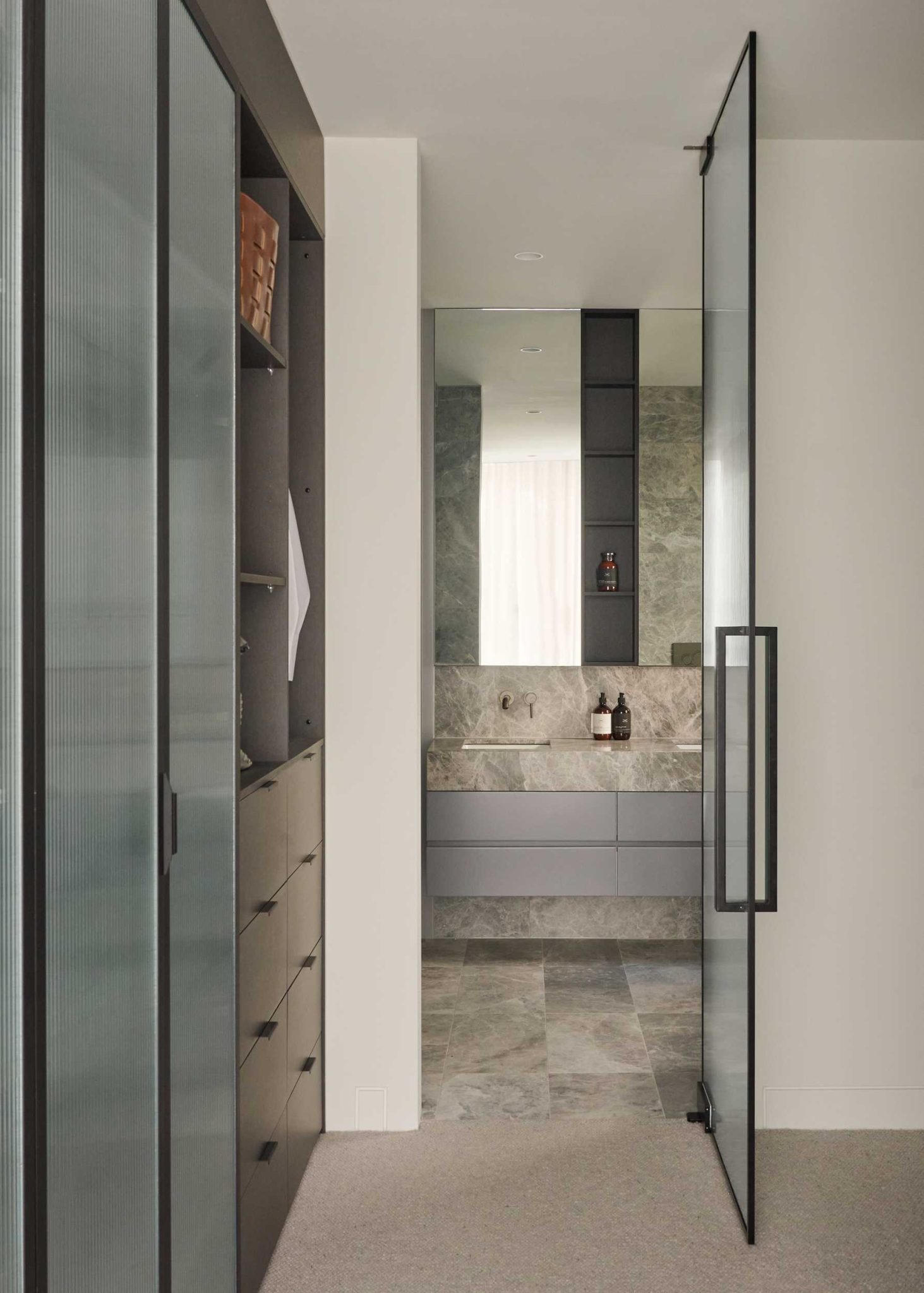 Phòng ngủ kết nối với tủ quần áo không cửa ngăn, sau đó kết nối với phòng tắm riêng.