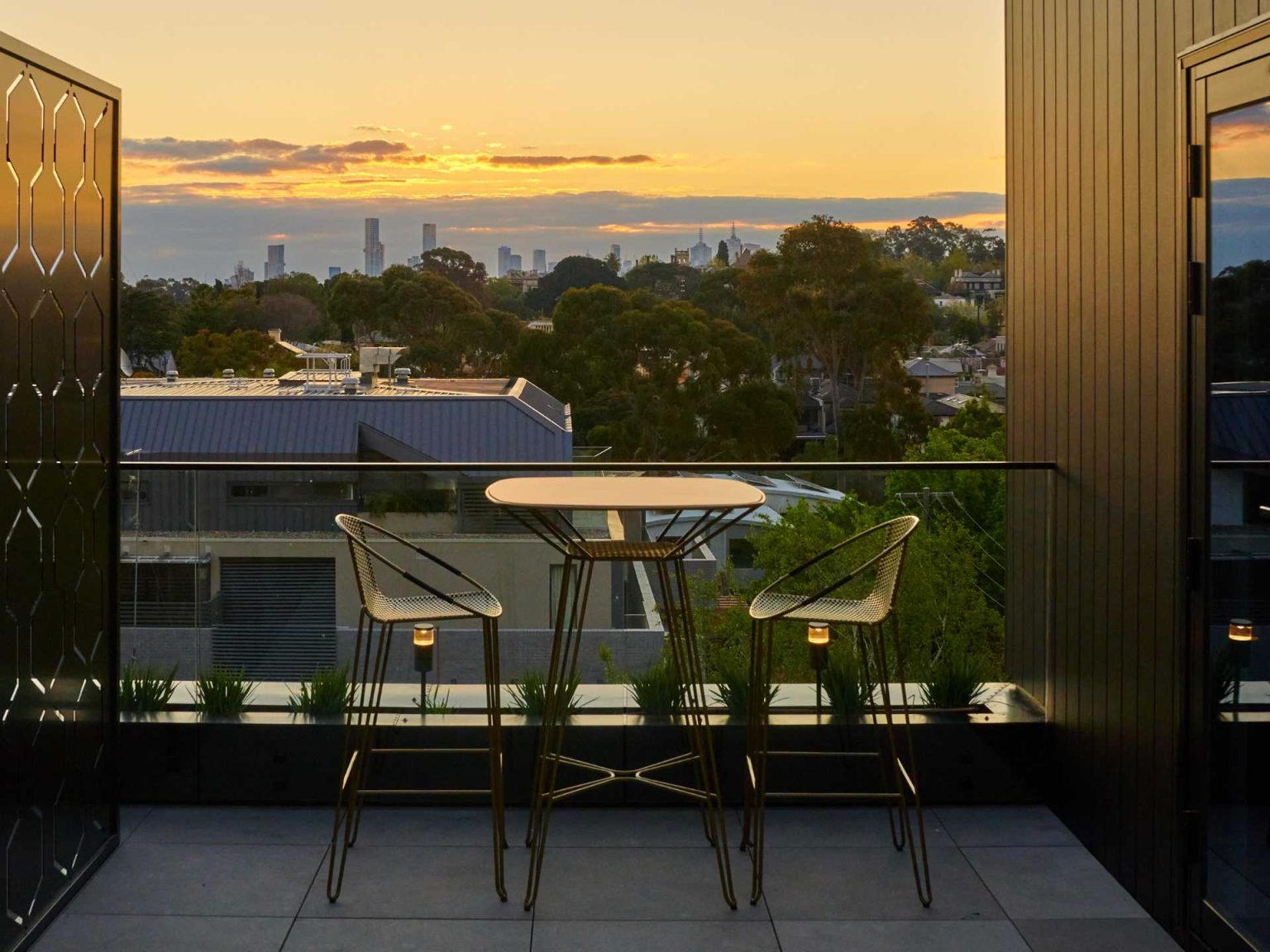 Căn nhà phố cũng bao gồm không gian ngoài trời với tầm nhìn ra thành phố ở phía xa.